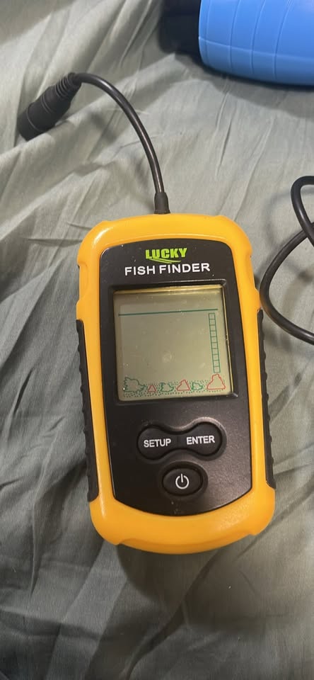 Portable fish finder with yellow and black housing, LCD display, Setup/Enter controls, includes sonar transducer and cables. Condition: Used. Brand: Lucky.