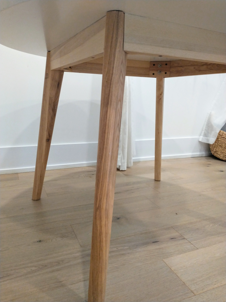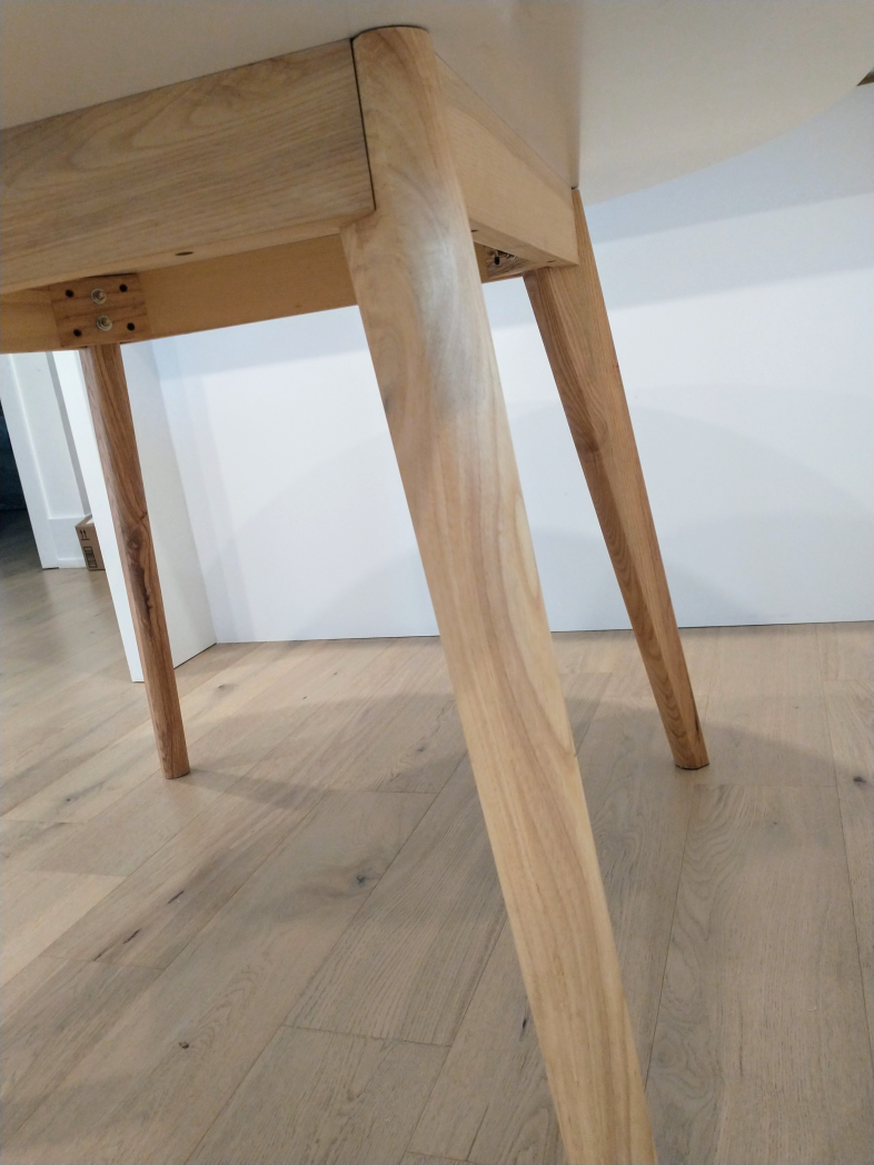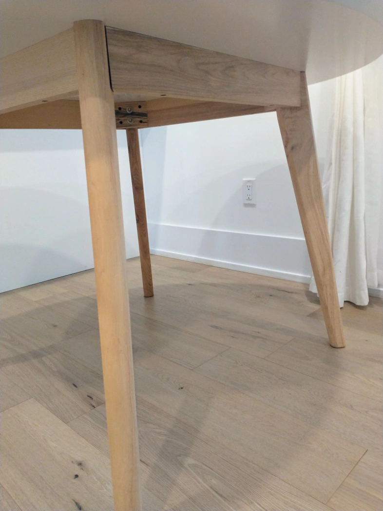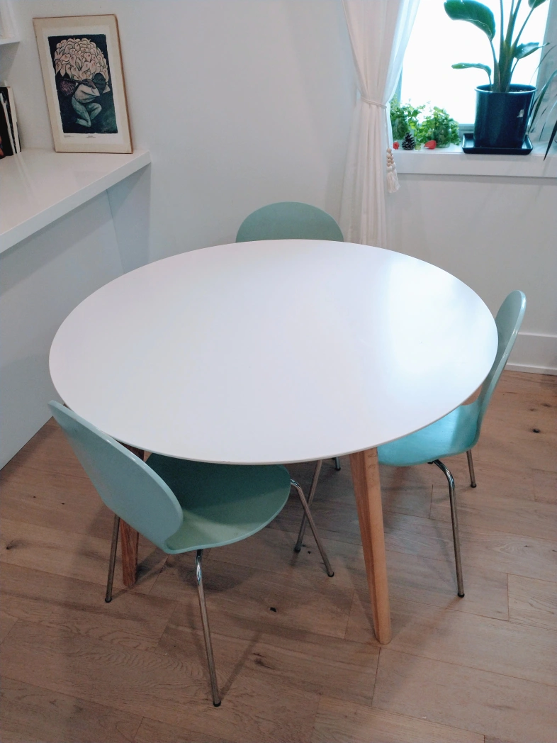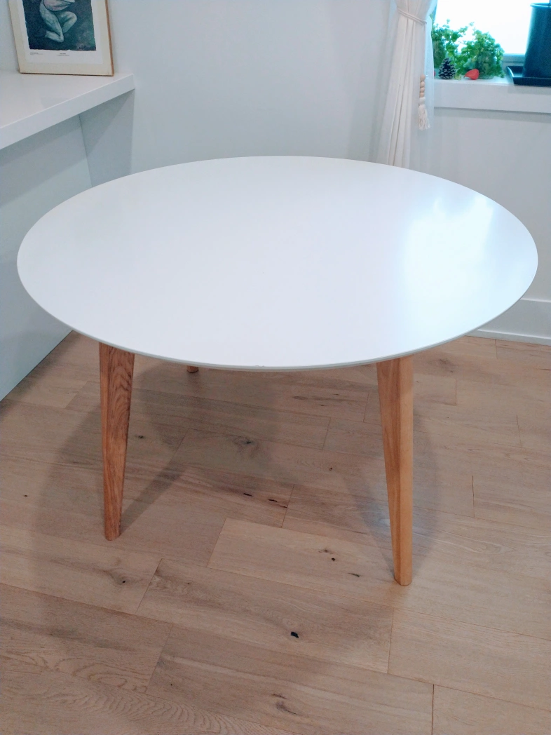 Sturdy round white table with light wood legs. Seats 4 people. Great for small spaces and everyday use. Easy to clean. Chairs (2) are free if still available.