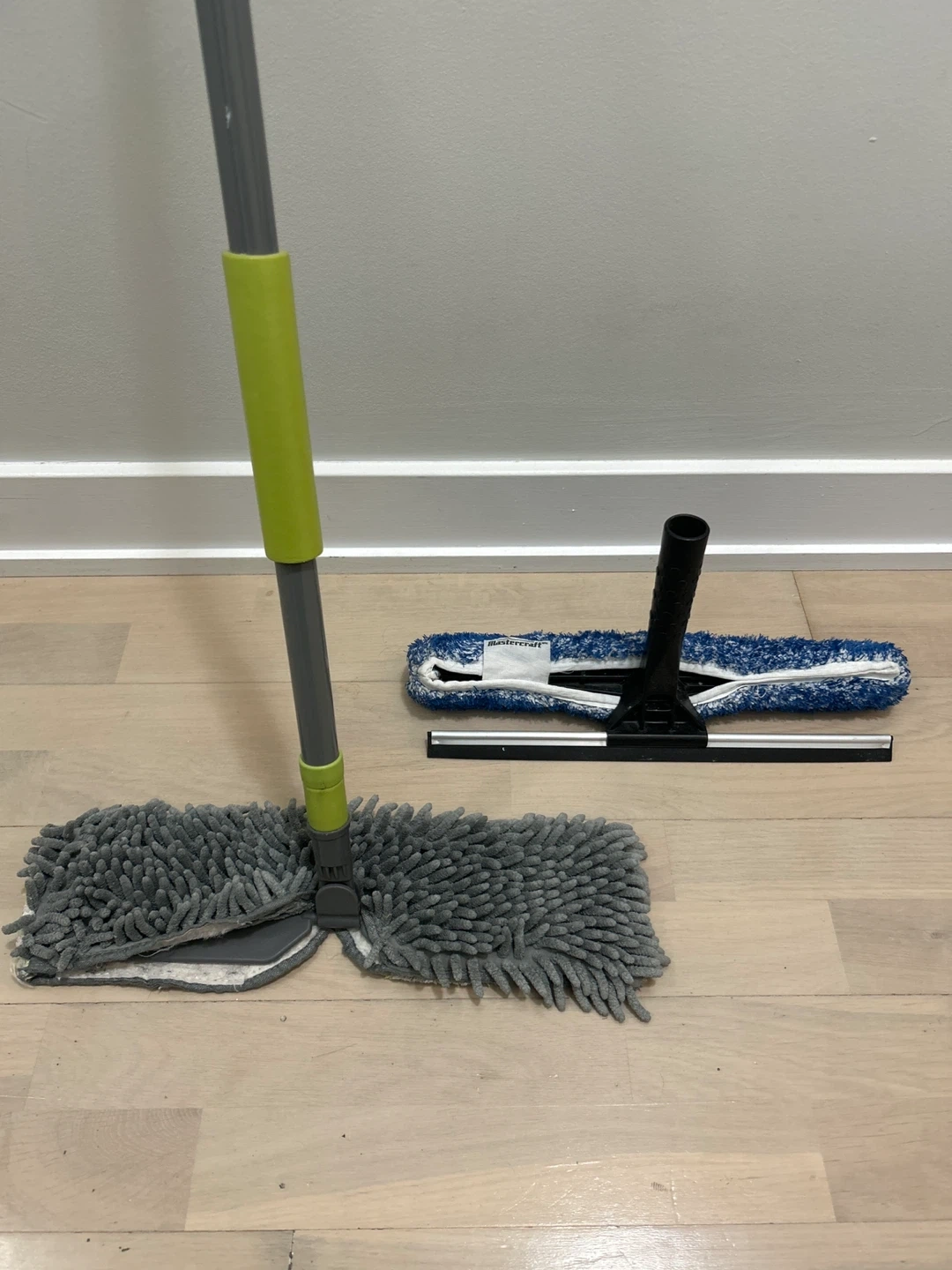 Free mop with a grey microfiber head and a green handle. Also includes a window squeegee with a blue and white microfiber cleaning pad and a black handle.