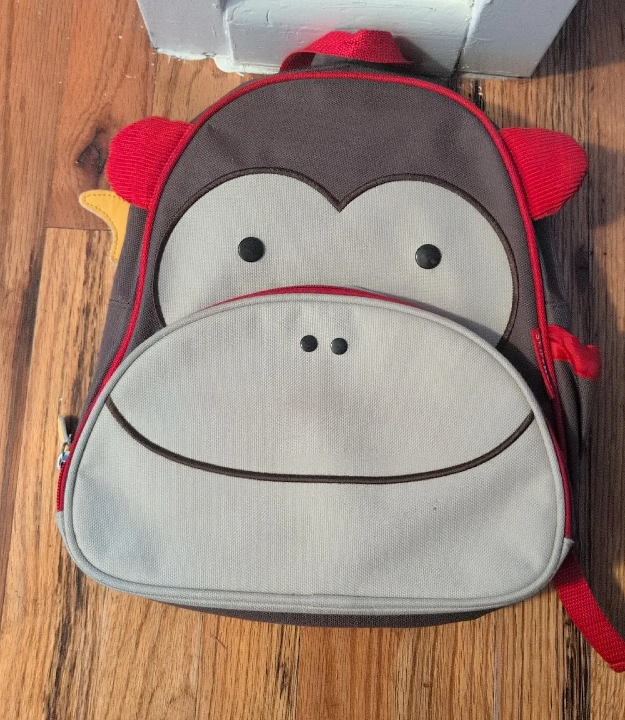 Here's a cute Skip Hop Zoo Pack backpack featuring a monkey design! It's in great condition and perfect for little ones to carry their essentials. The backpack has a gray and white body with red accents, making it both fun and functional