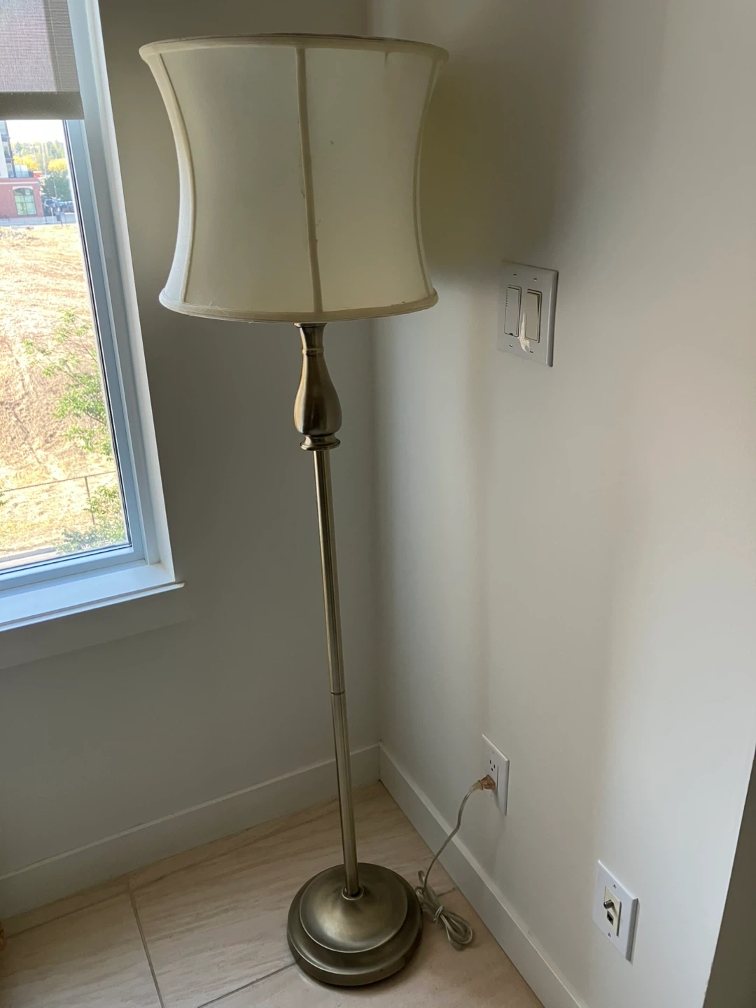 Selling a floor lamp that's in great condition! It has a classic design with a light-coloured shade and a brass-toned base and pole. It would look great in any living room or bedroom