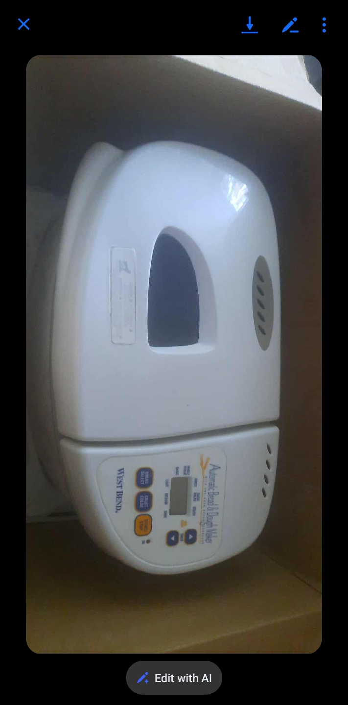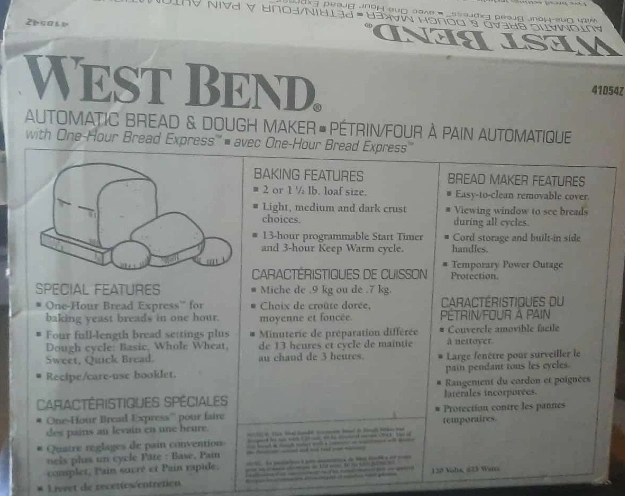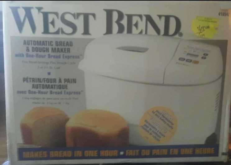 Selling a West Bend Automatic Bread & Dough Maker! It makes bread in just one hour. It has settings for light, medium and dark crust. Also features a 13-hour programmable start timer and keep warm cycle. It can make 2 or 1 1/2 lb loaf sizes. Opened but never used.