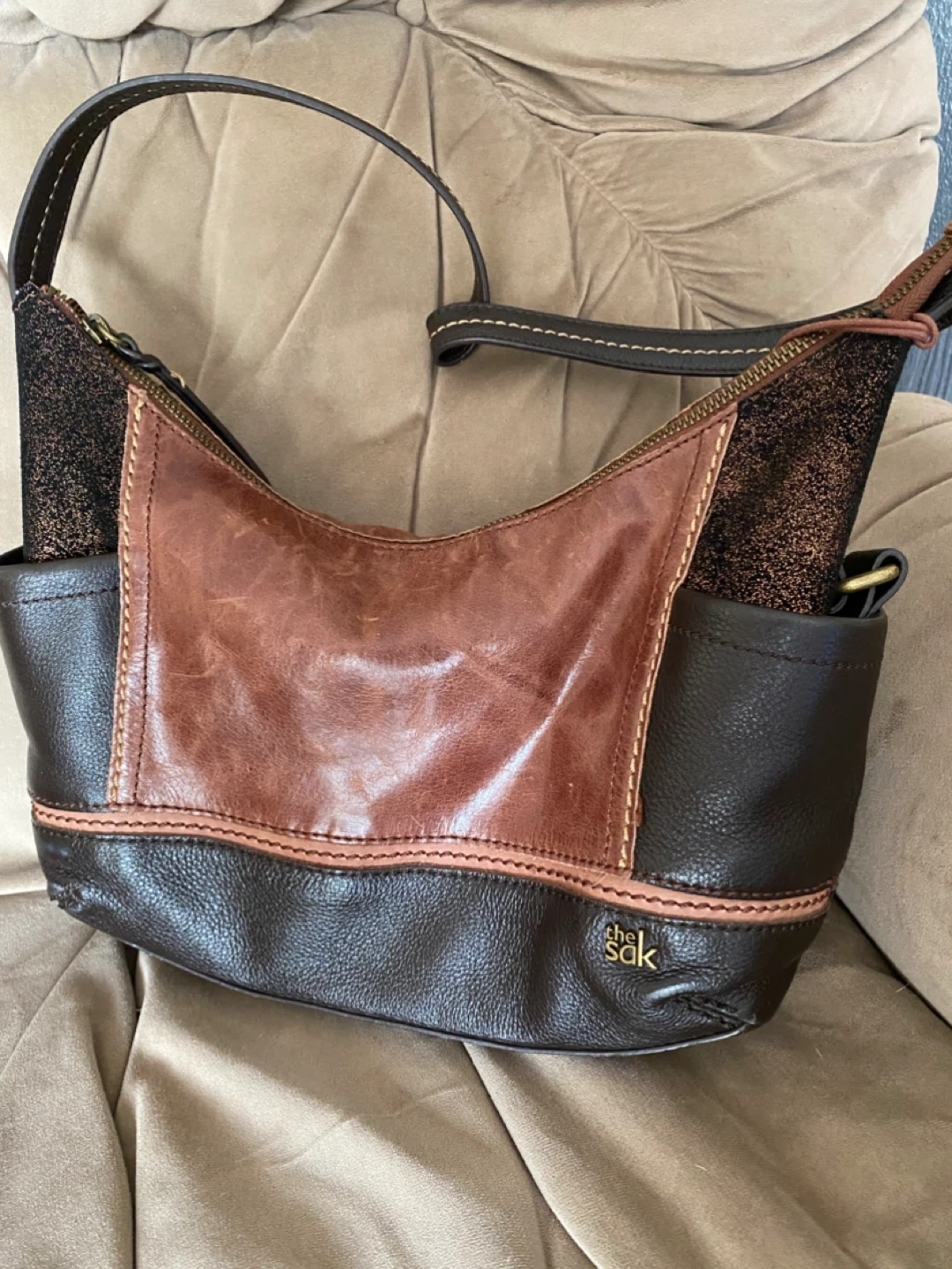 The Sak shoulder bag is in great condition! Real leather with a unique design with a mix of brown and black leather. Perfect for everyday use!