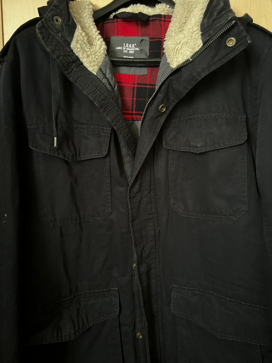 Selling a L.O.G.G. black winter jacket. It has a sherpa-lined hood and a red and black plaid interior. It's perfect for keeping warm during the colder months!