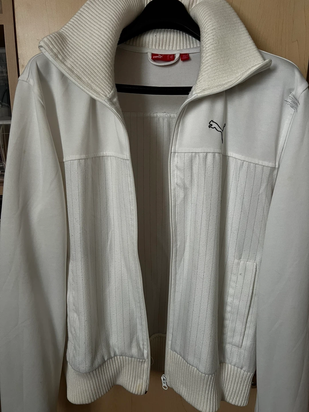 Selling a Puma track jacket in white! It's in great condition and perfect for layering or wearing on its own. The classic design and comfortable fit make it a versatile addition to any wardrobe