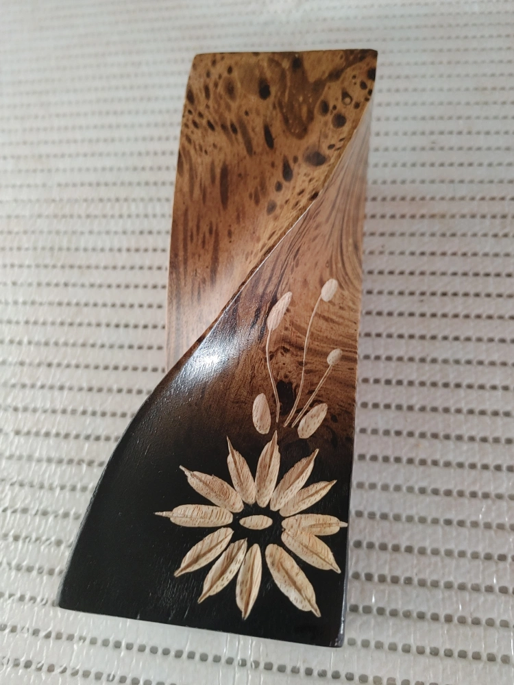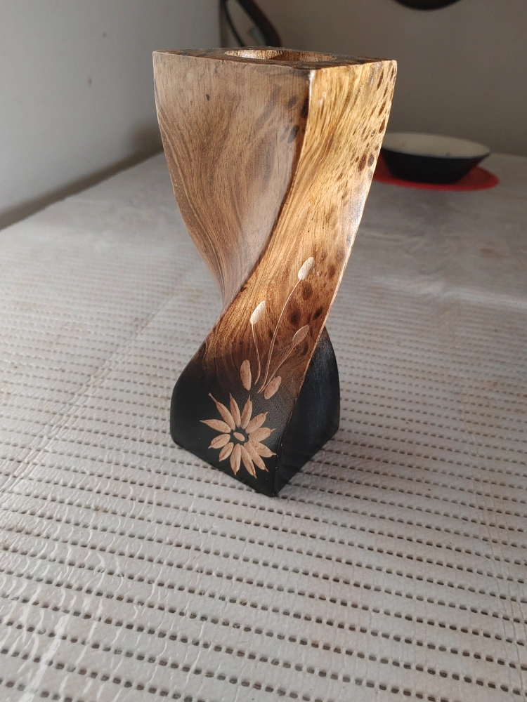 Selling a unique hand-carved wooden candle holder. It features a beautiful floral design and a twisted shape. Would look great in any room!