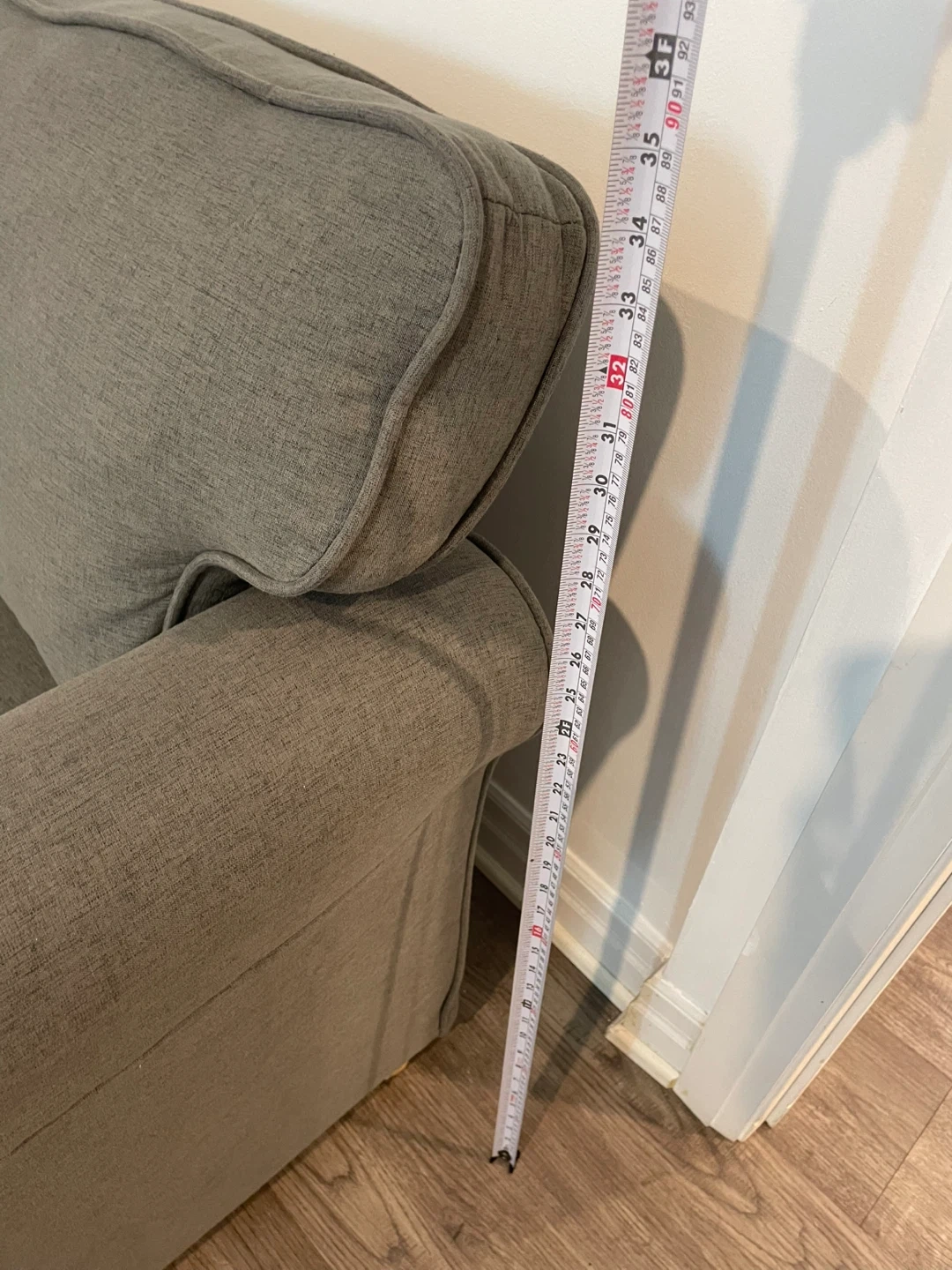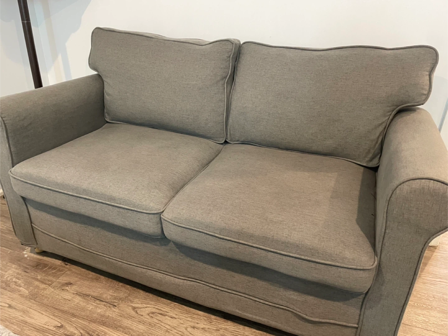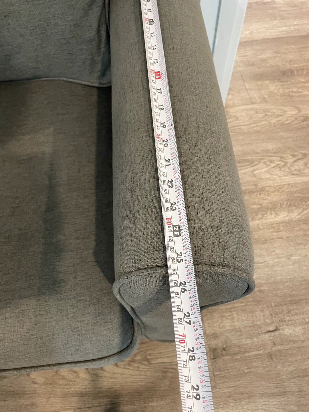 Selling a comfy grey loveseat! The height is approximately 35 inches and the width is about 59 inches. Perfect for a small space or apartment Everything can be separated and has zippers so you can wash it