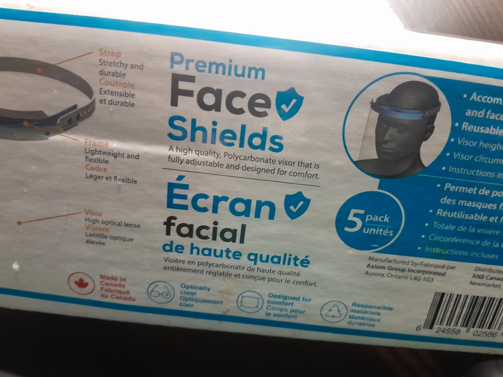 Selling a 5 pack of Premium Face Shields. These face shields have a high-quality polycarbonate visor that is fully adjustable and designed for comfort. The visor is made with a high optical lens. Made in Canada