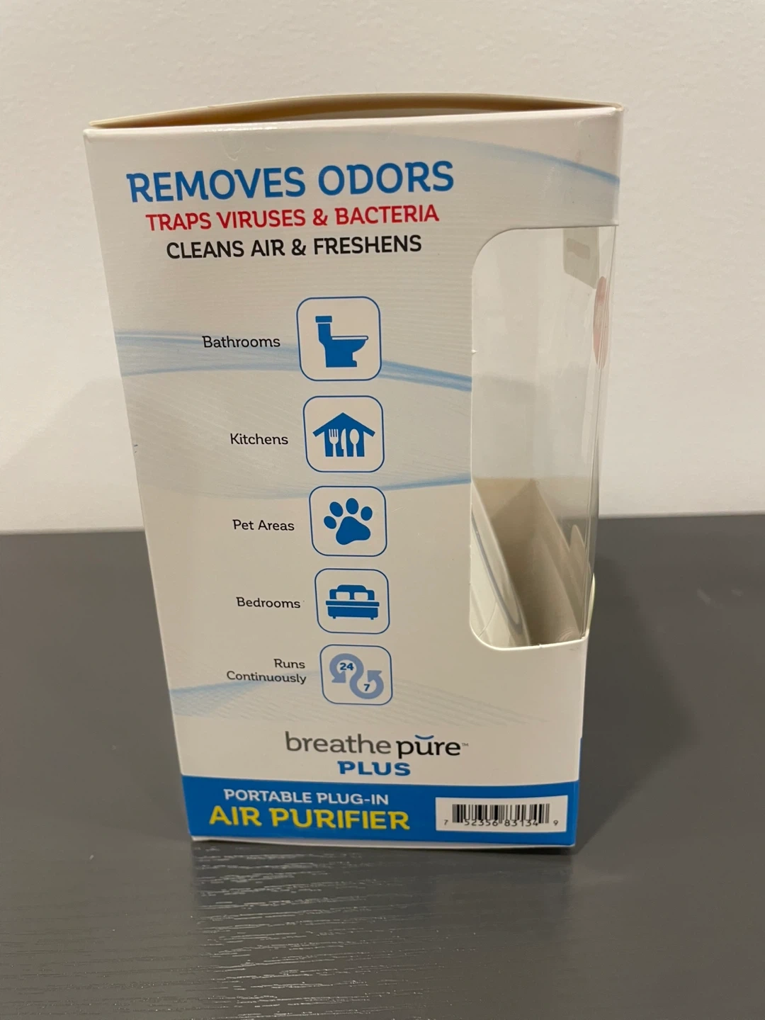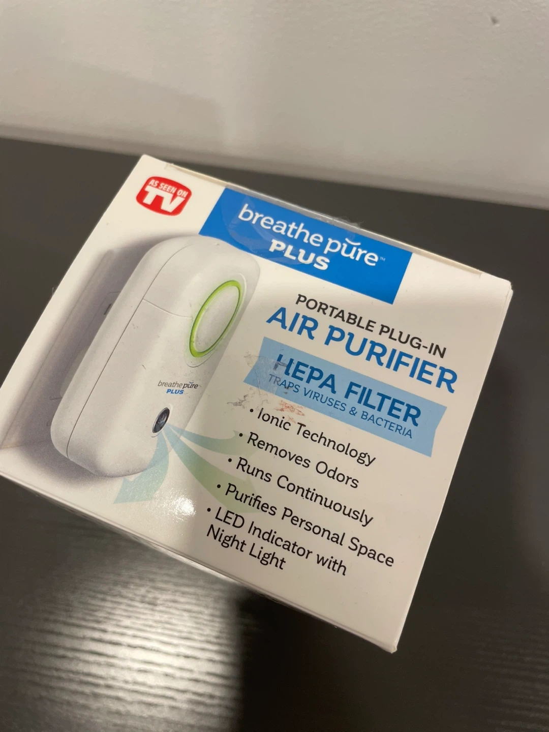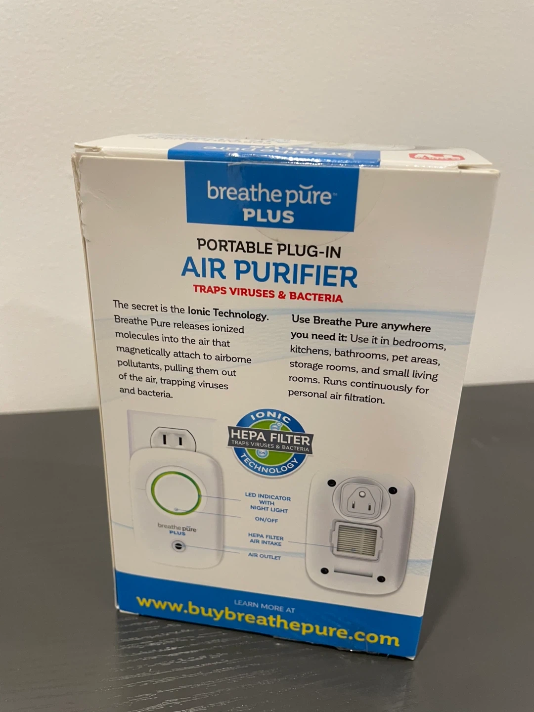 I'm selling a brand new Breathe Pure Plus portable plug-in air purifier, still in its original box! It features HEPA filter and ionic technology to trap viruses and bacteria, remove odours, and purify personal space. It also has a night light function. Great for bedrooms, kitchens, pet areas, and bathrooms!