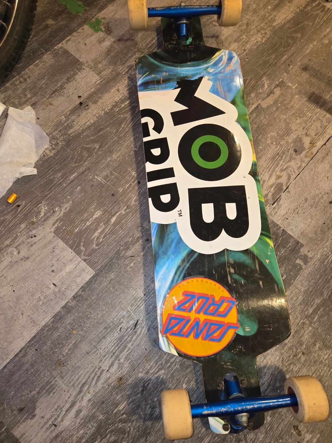 This Santa Cruz longboard features a Mob Grip deck. The trucks are blue, and the wheels are a creamy yellow. It's a solid board for cruising around town!