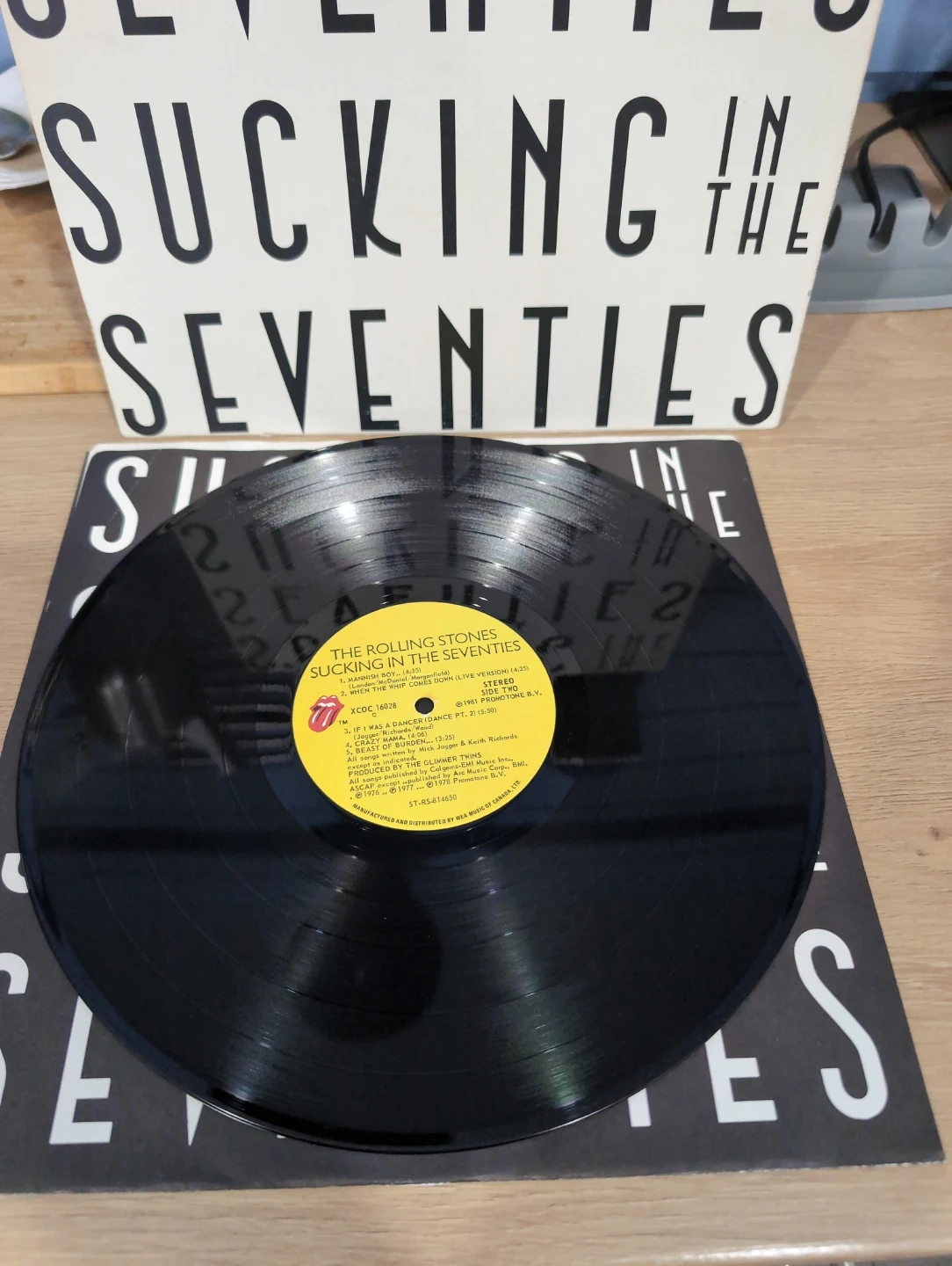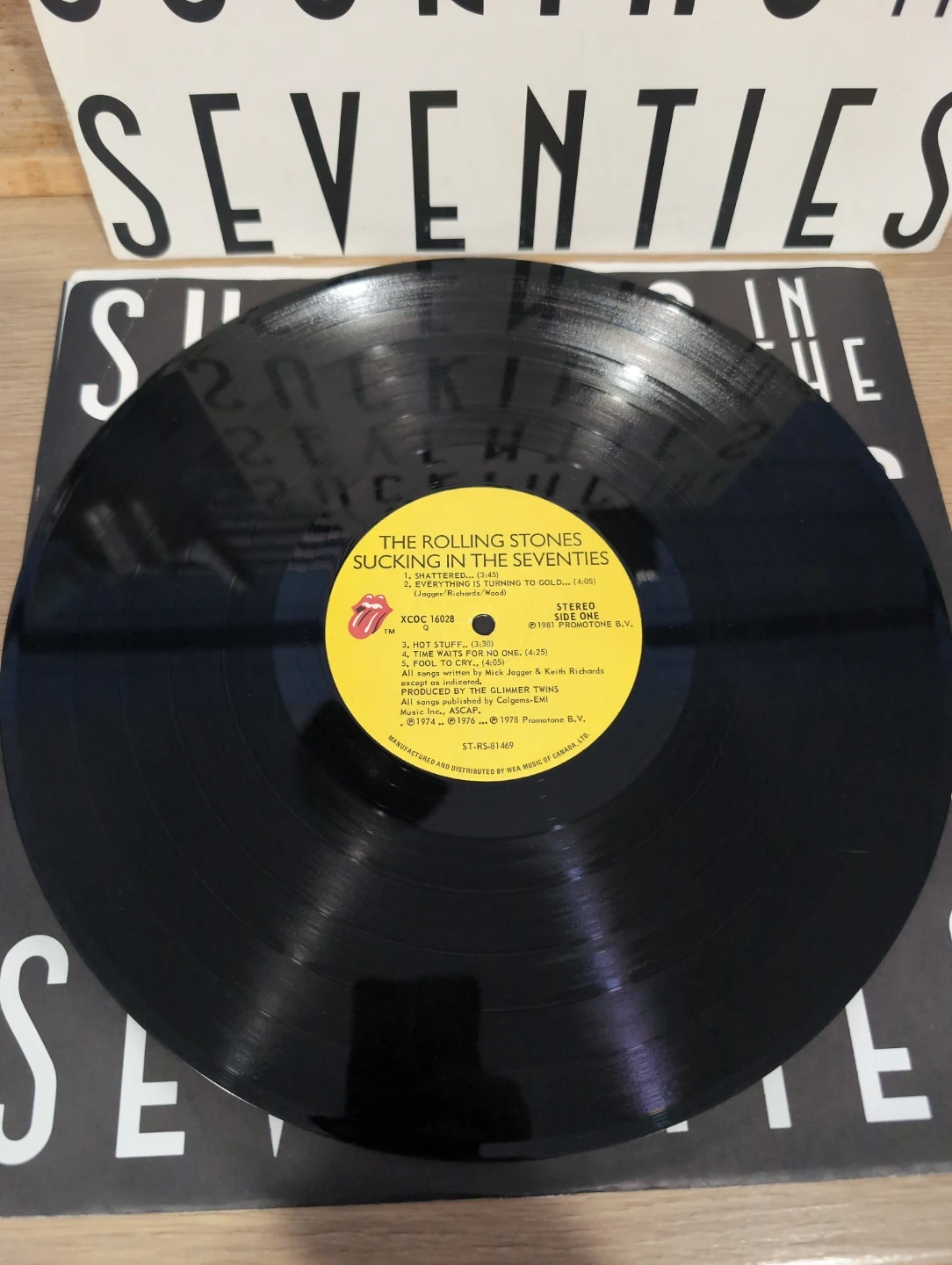 This is a vinyl LP record by The Rolling Stones titled 'Sucking in the Seventies'. It features tracks like "Shattered" and "Everything is Turning to Gold". The record is in good condition.