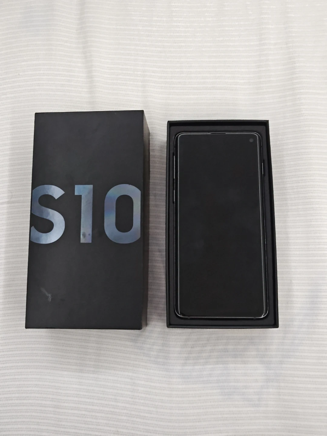 Samsung Galaxy S10 smartphone in black. It's got 128 GB of storage. Includes original box and packaging.