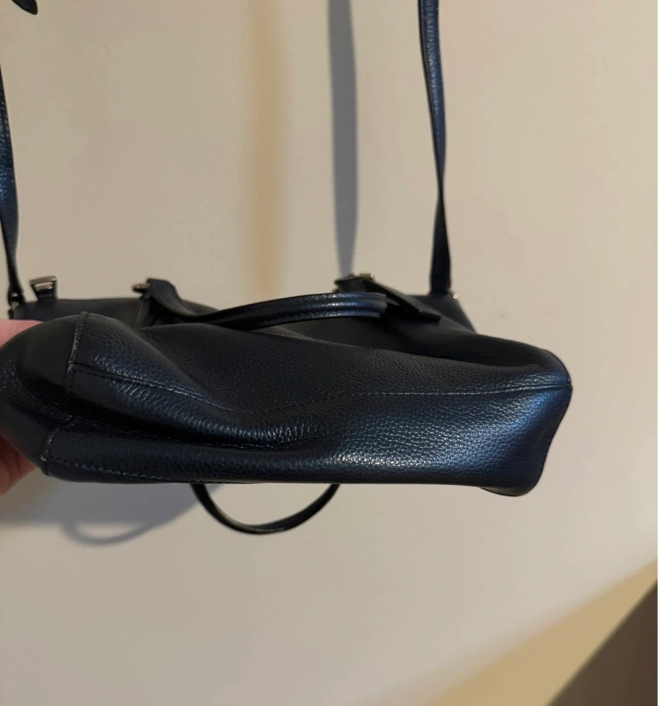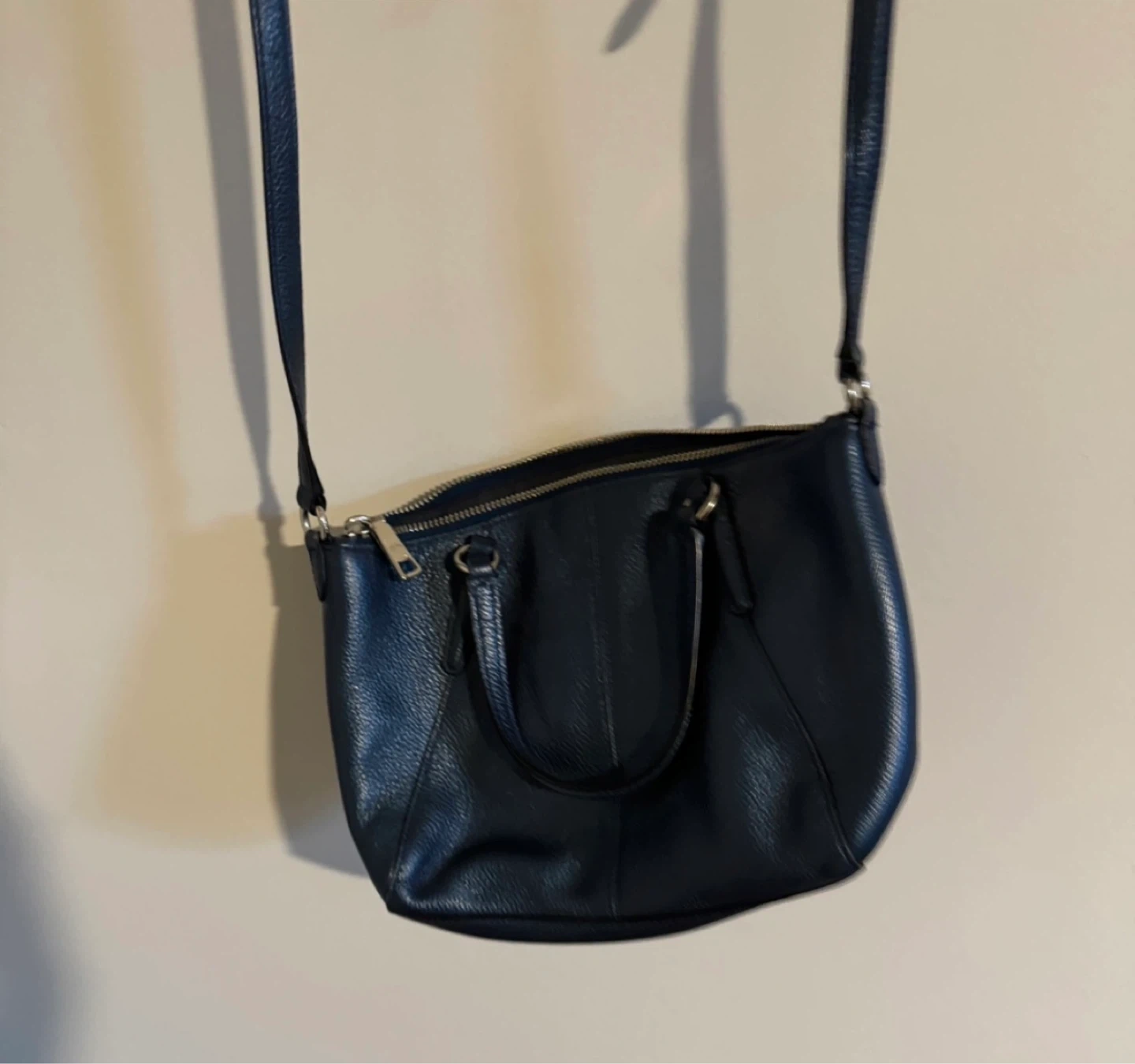 The bag has a zipper closure and an adjustable crossbody strap, along with smaller handles to be a tote bag.