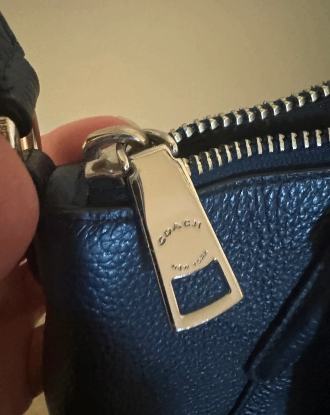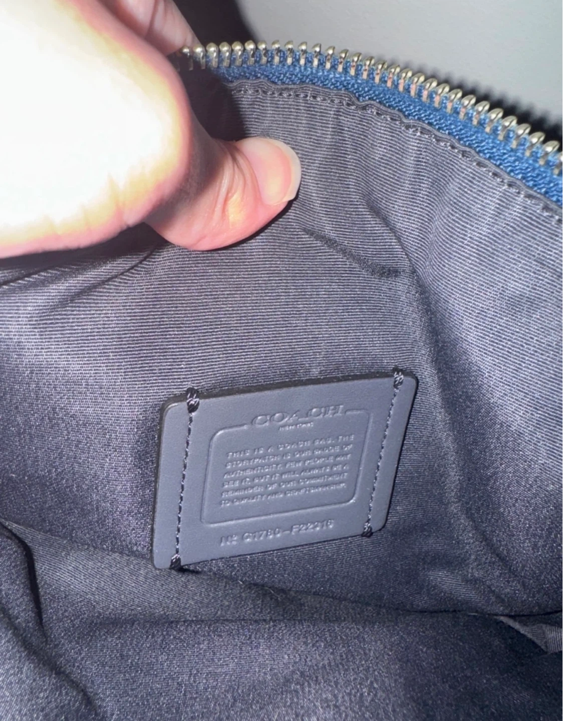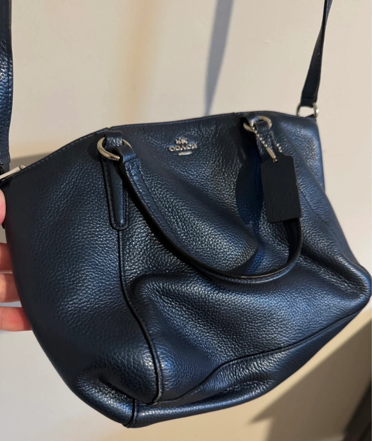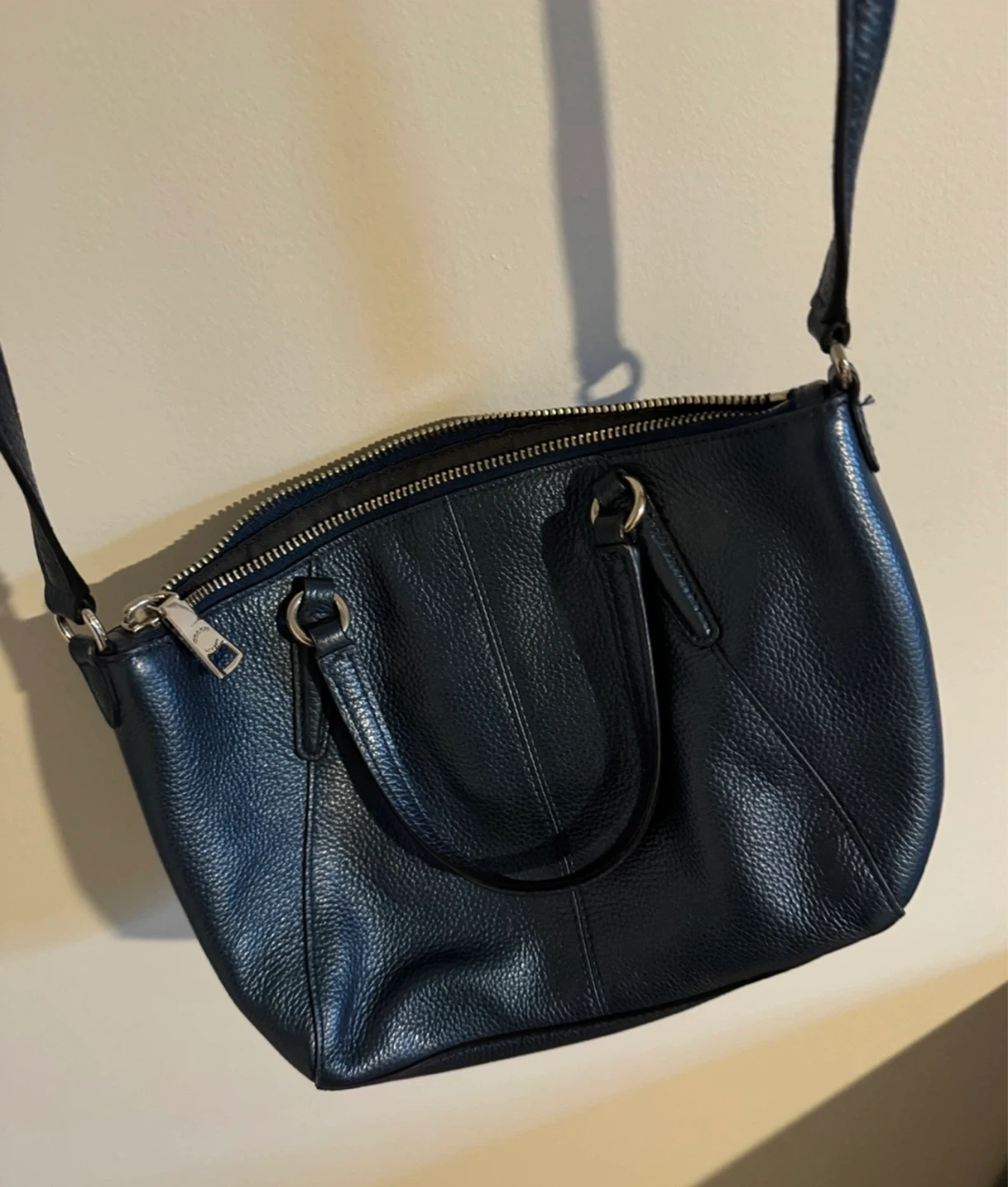 Coach leather purse in metallic navy blue outside and dark blue interior lining.