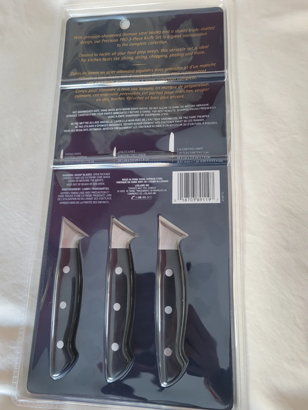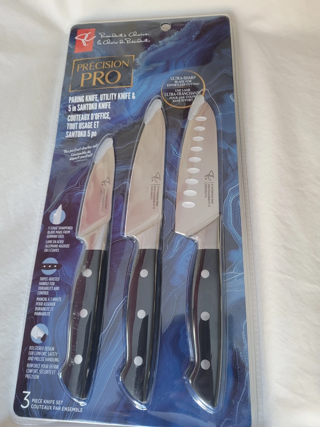 NEW! This Precision Pro 3-piece knife set features German steel blades and a triple-riveted design. It's great for kitchen tasks like slicing, dicing, and chopping. The set includes a paring knife, utility knife, and a 5-inch Santoku knife.