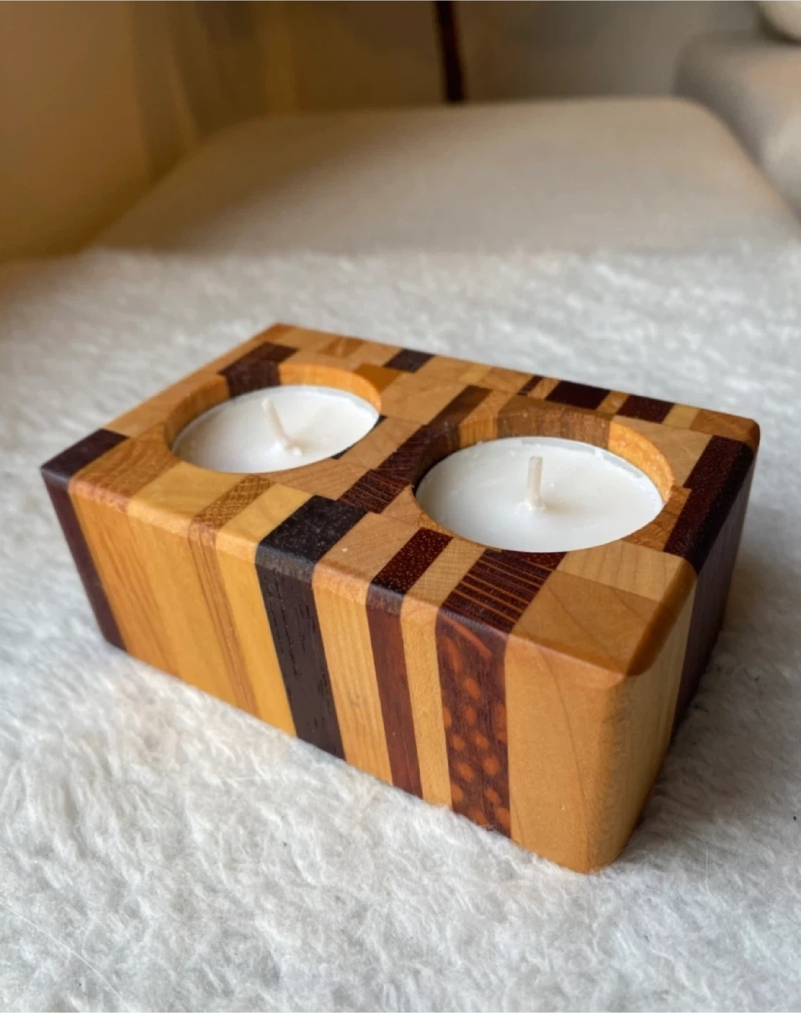 This unique wooden tealight candle holder is crafted from various wood pieces crafted to fit together by hand. The bottom is also very cool if you want to just use it as a display object.