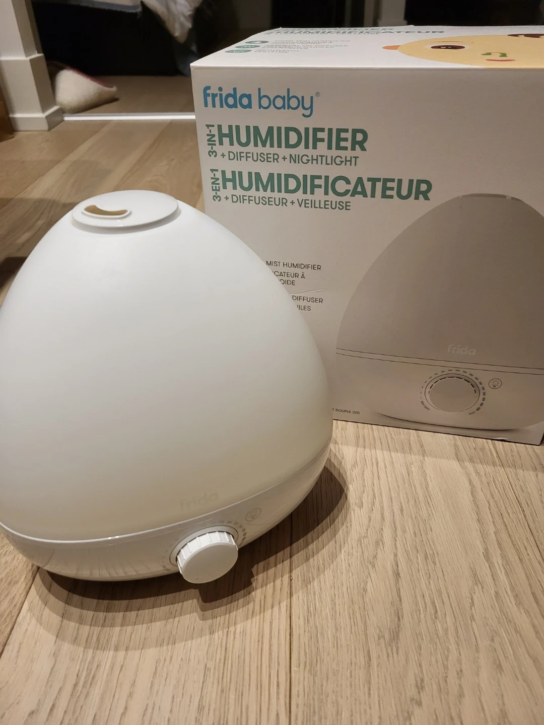 Selling a slightly used Frida Baby 3-in-1 Humidifier, Diffuser, and Nightlight. This is great for adding moisture to the air, diffusing essential oils, and providing a soft nightlight for your little one. It's in excellent condition and comes with the original box