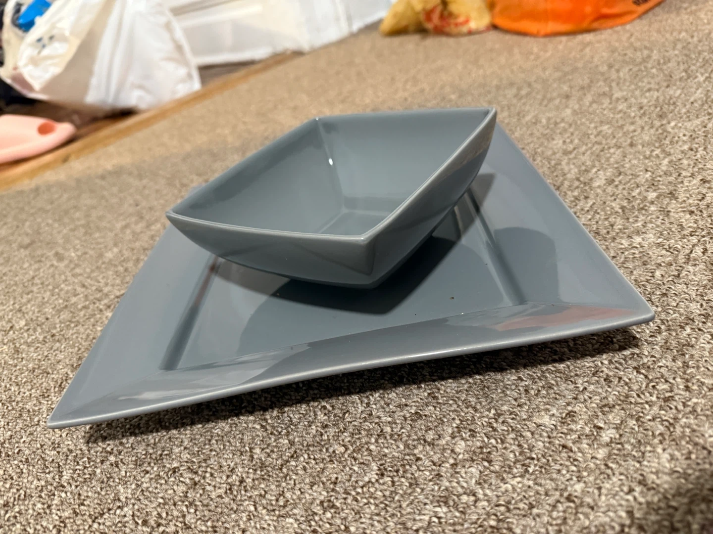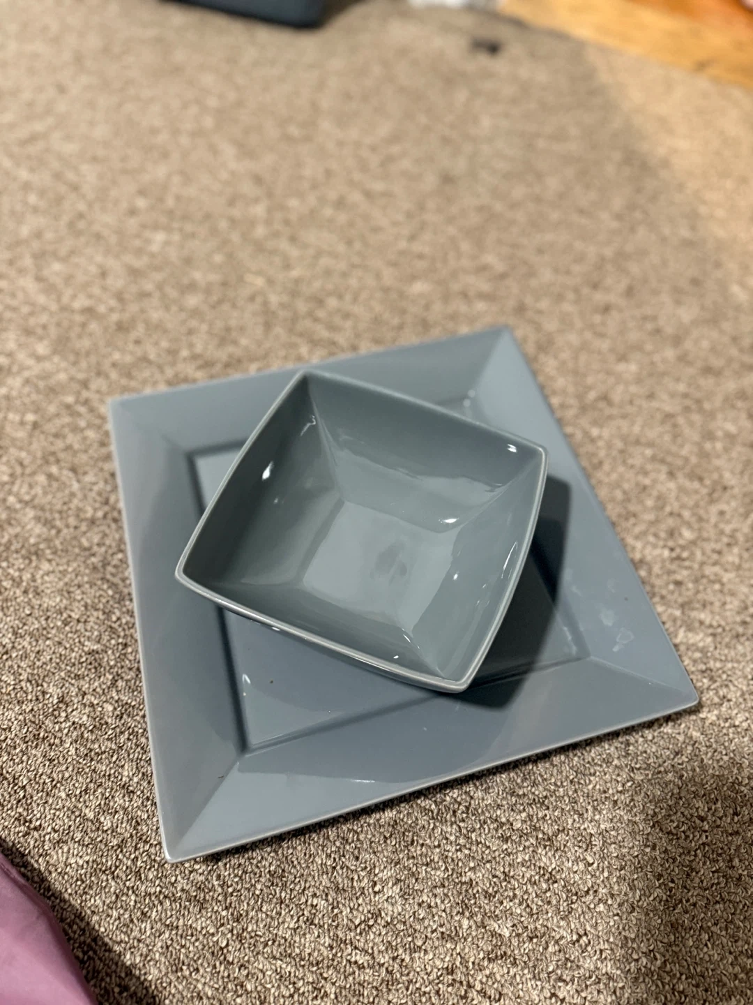 Selling a gray square dinnerware set, which includes a bowl and a plate. They are in good condition and have a modern, minimalist design. Perfect for adding a touch of elegance to your dining table!