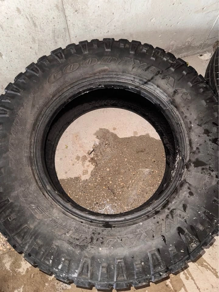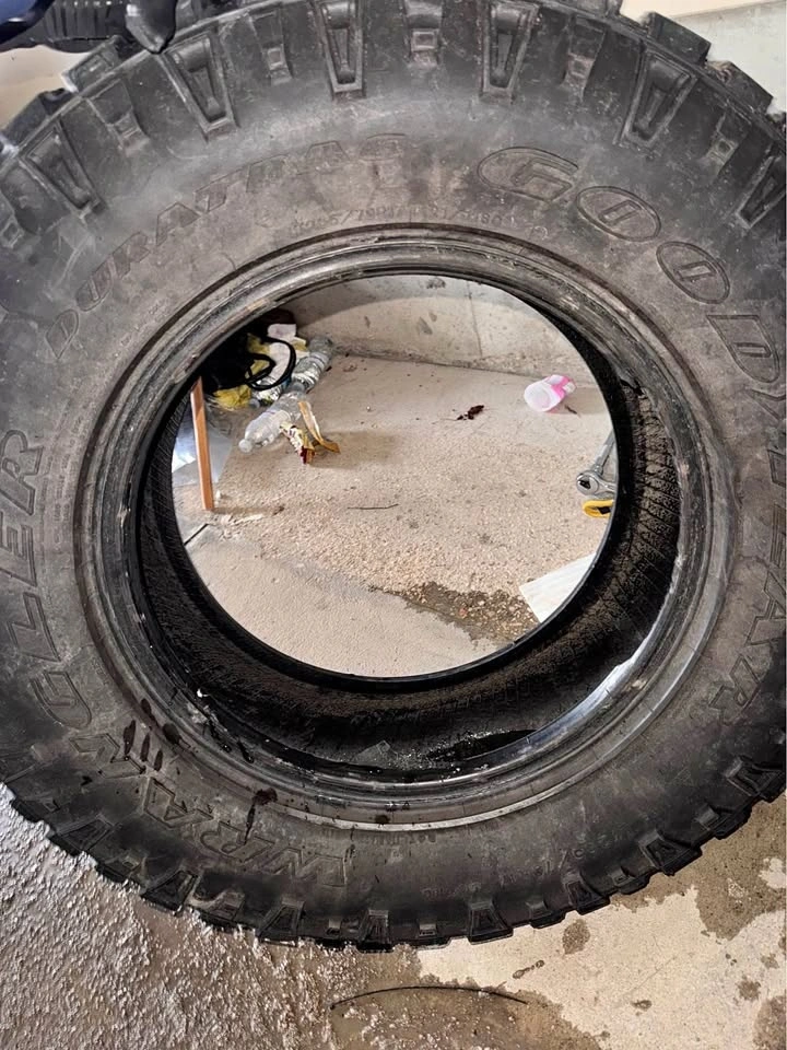 Selling 2 Goodyear Wrangler Duratrac tires. They have a good amount of tread left and are both studded. One tire has a little damage on the inner tube as shown in the first picture, but it will still hold air and be good to use.