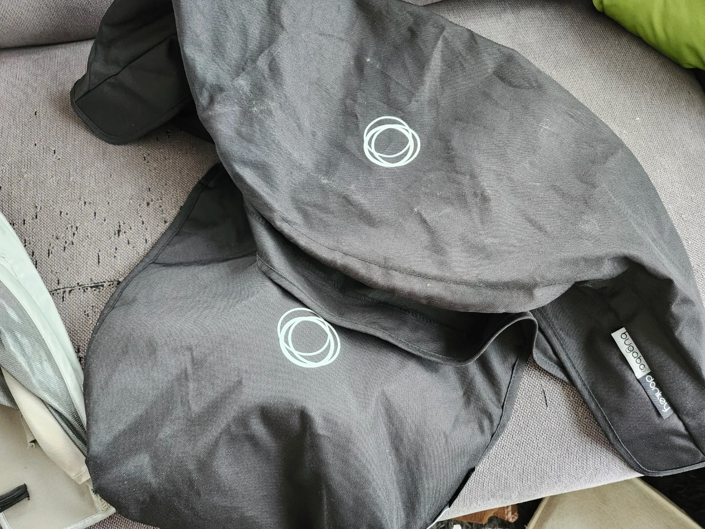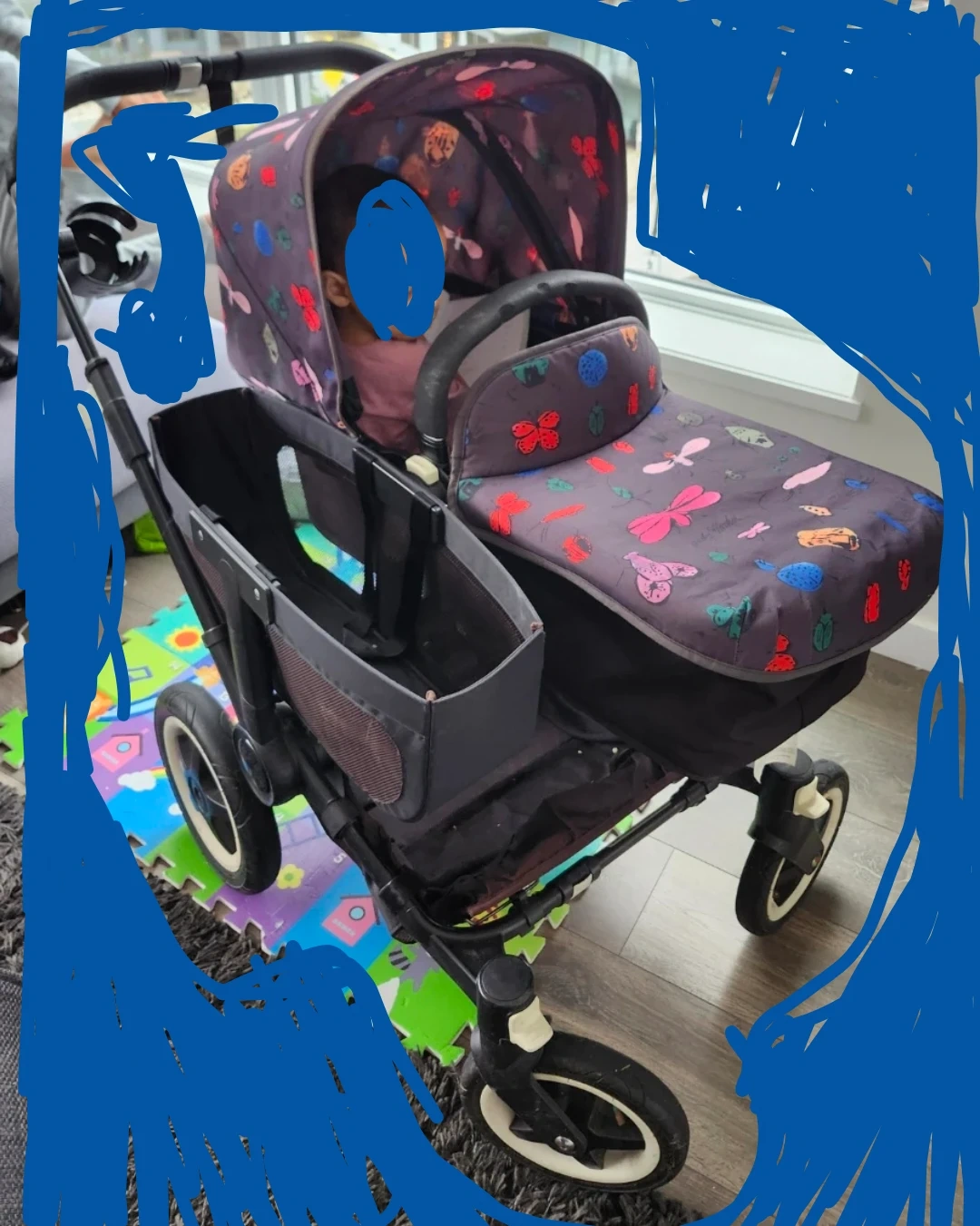 This is a Bugaboo Donkey Duo stroller in black with a fun bug print canopy. It's a versatile double stroller, perfect for families with an infant and a child. The fabric has a playful design featuring butterflies and beetles. It's a sturdy and reliable option for getting around town! It comes with a kids stroller seat but you will need to buy or make a second plank to accommodate both infant and kid. It has had at least 3 families, so it's well loved. I bought it for $500 and it was well worth it. Comes with bonus winter bunting bag.