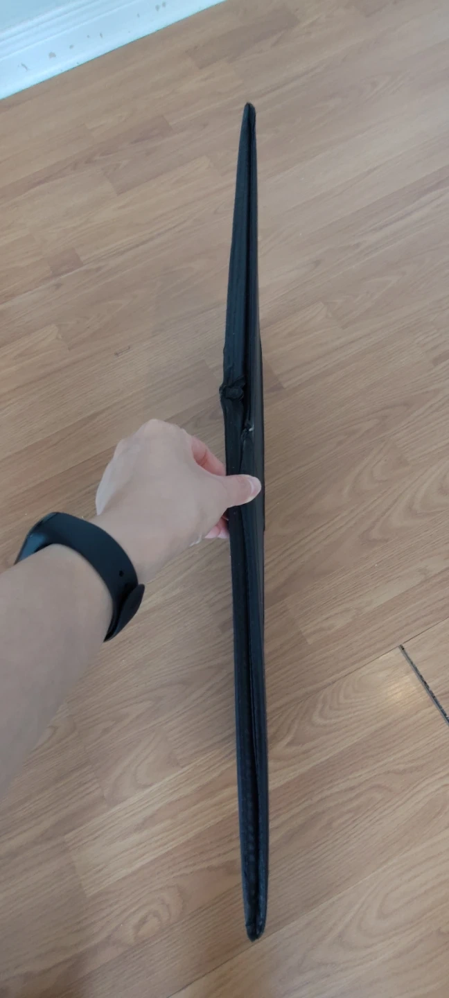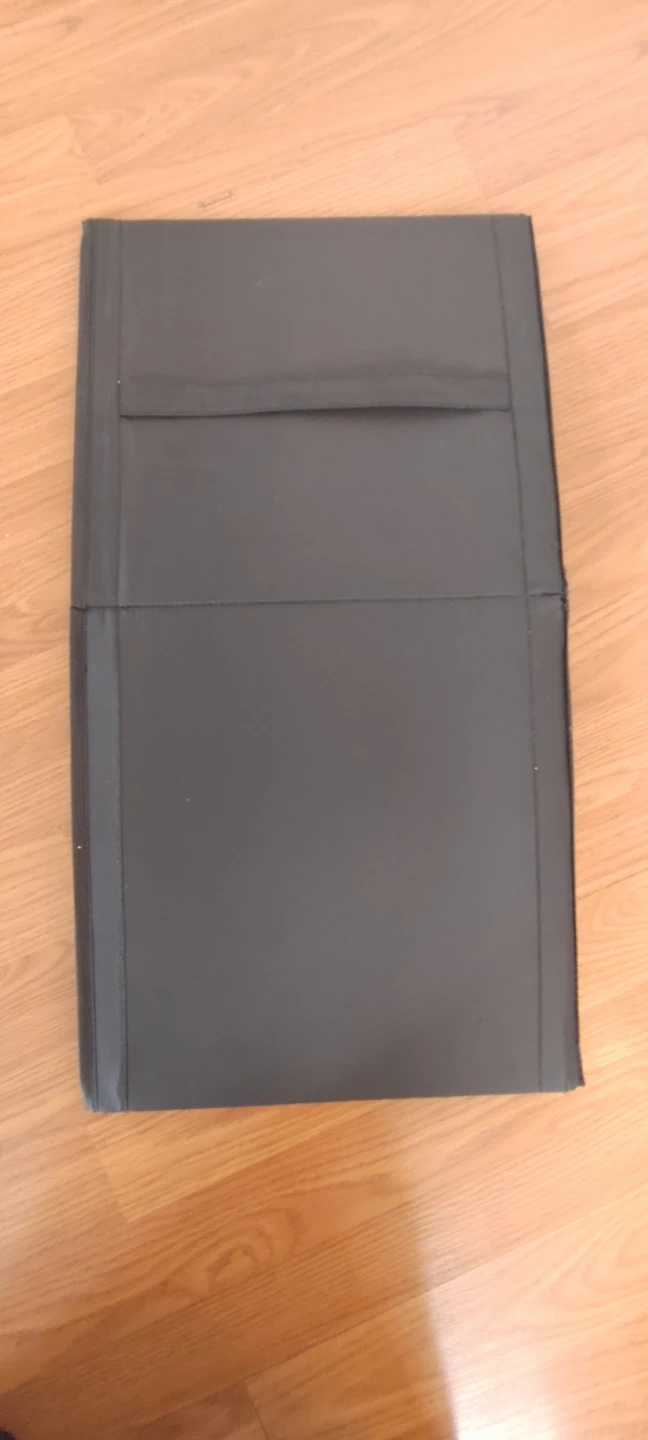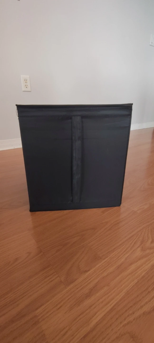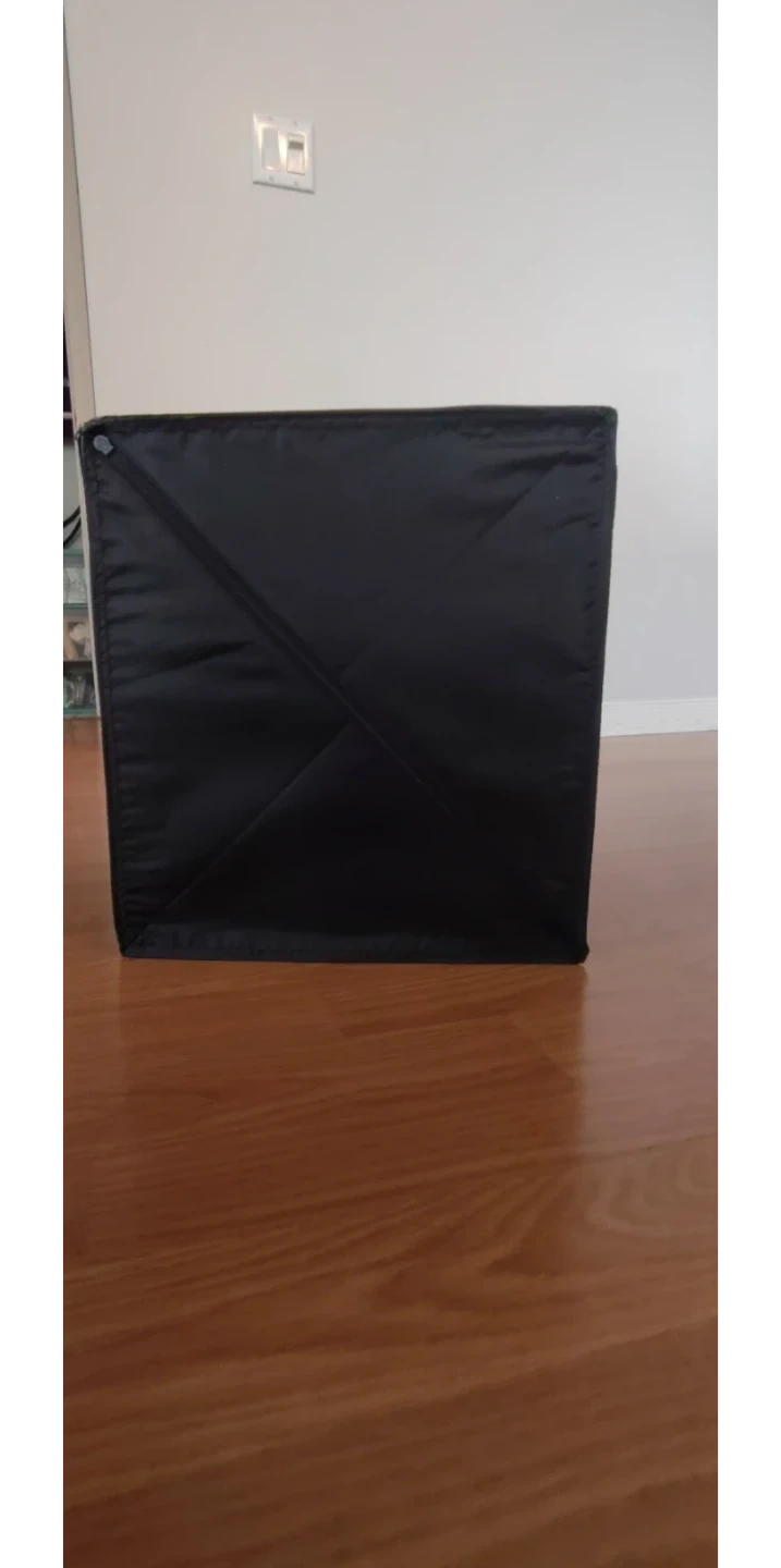 This is a black collapsible storage bin. It's made of fabric and can be folded flat for easy storage. The bin has a strap on the back and a zippered closure on one side.