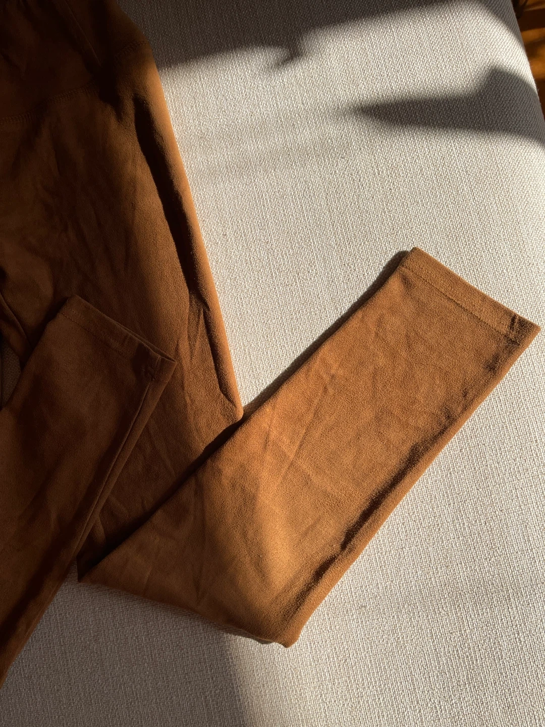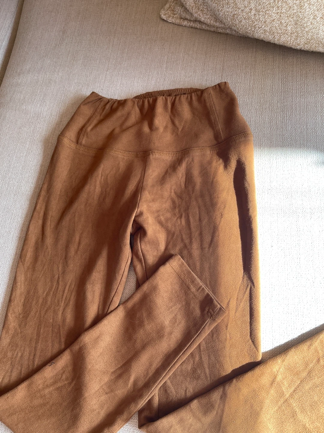 Comfortable brown leggings with a faux suede finish. High-waisted design with an elastic waistband. Great for casual wear!