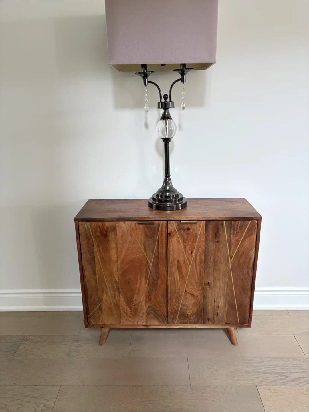 This stylish cabinet features a natural wood finish with decorative gold line inlays on the doors. It has two doors and rests on tapered wooden legs. Perfect for storing items and adding a touch of modern flair to any room!