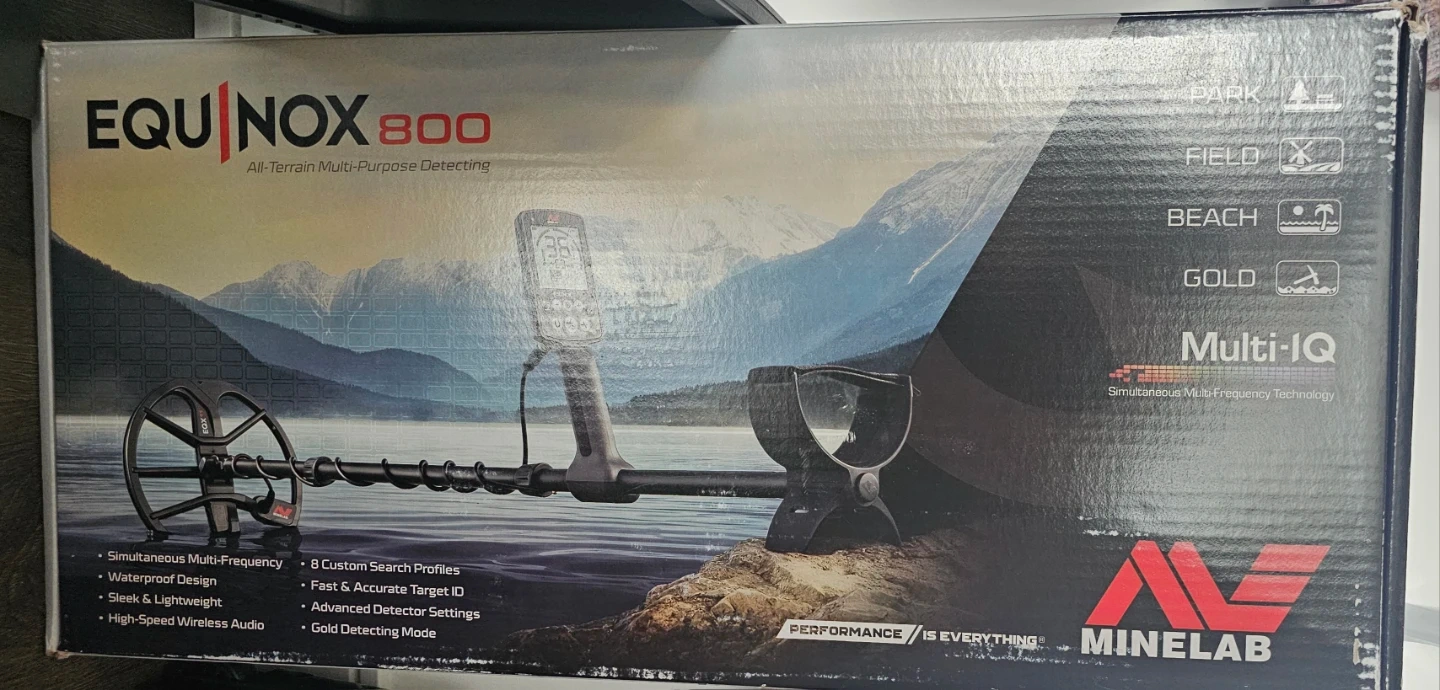 This is the Minelab Equinox 800, an all-terrain, multi-purpose detecting device. It features simultaneous multi-frequency technology, a waterproof design, and high-speed wireless audio. This detector is sleek and lightweight, perfect for extended use in various environments.