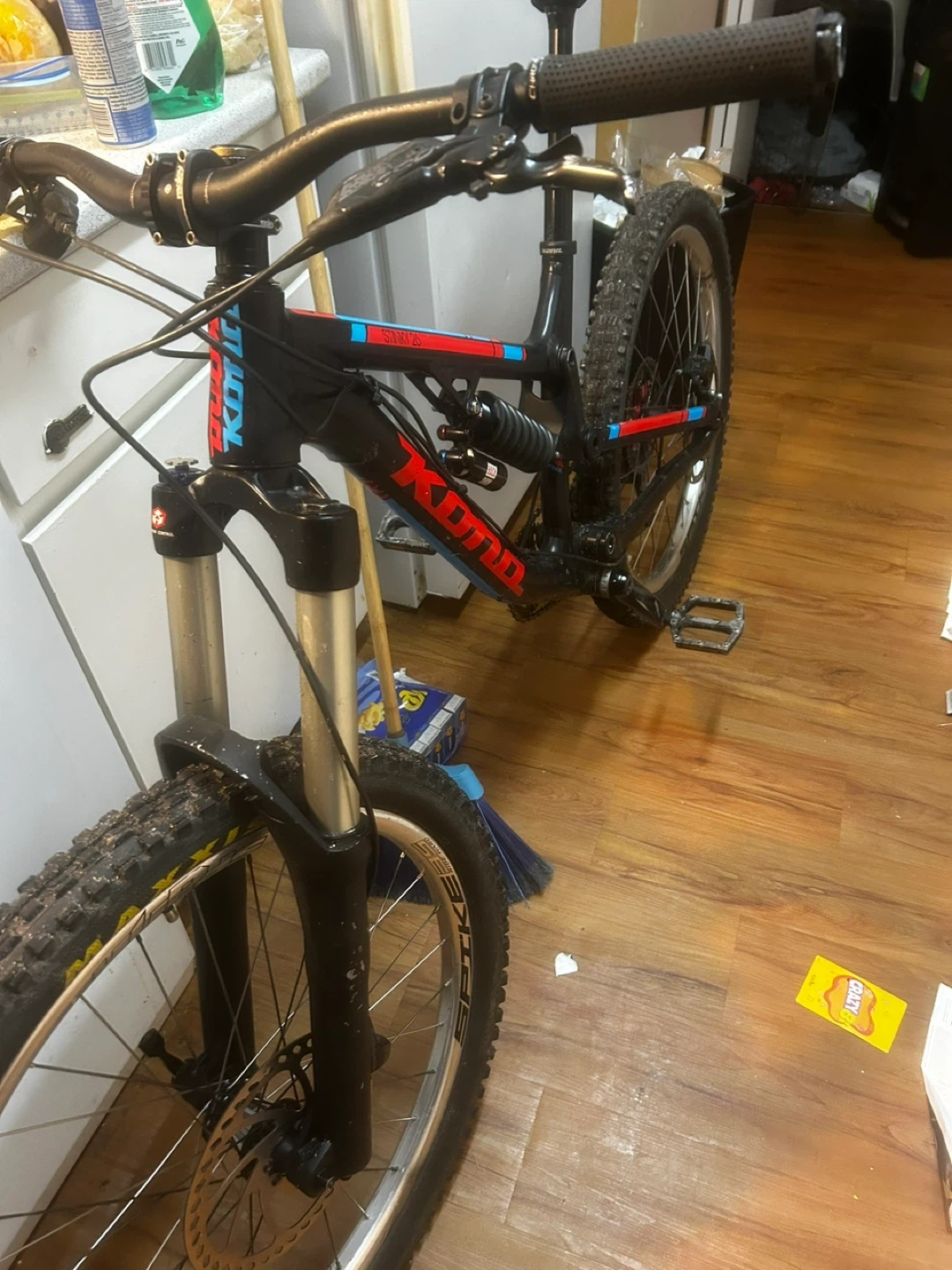 This is a Kona Stinky full suspension mountain bike. It features a black frame with red and blue accents. The bike has disc brakes and knobby tires for off-road riding.