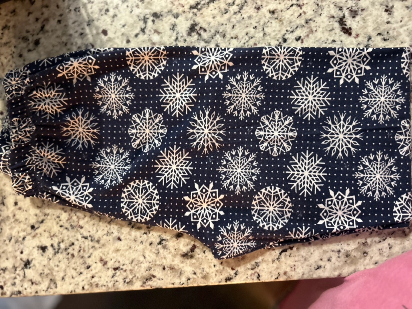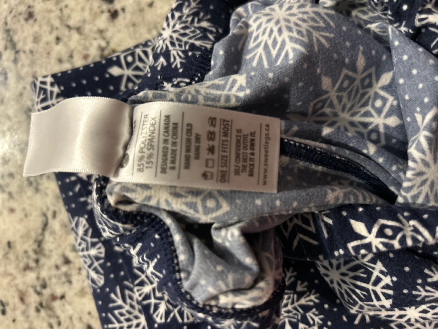 Navy blue sweetlegs leggings with a white snowflake pattern. Buttery Soft and stretchy fabric. Machine washable. Perfect for winter.