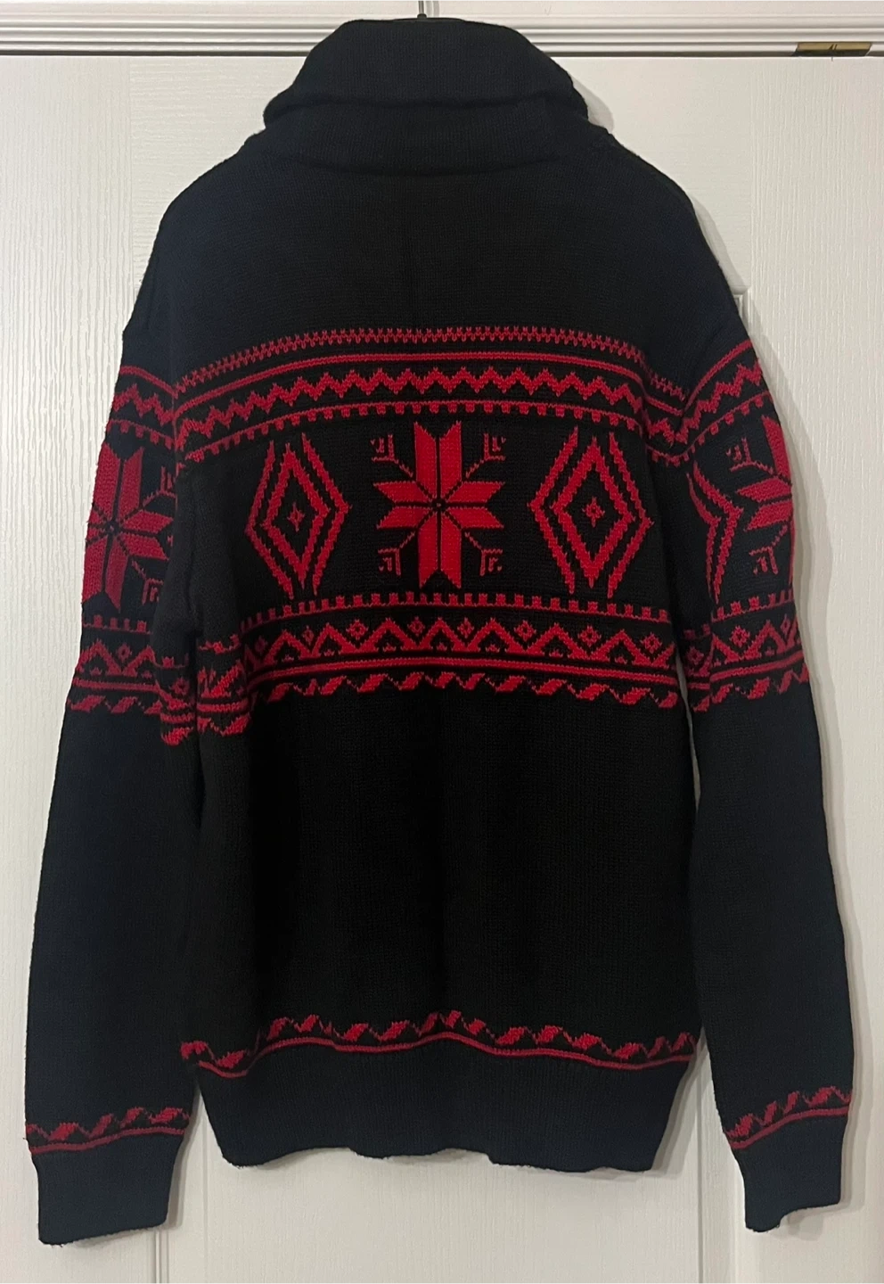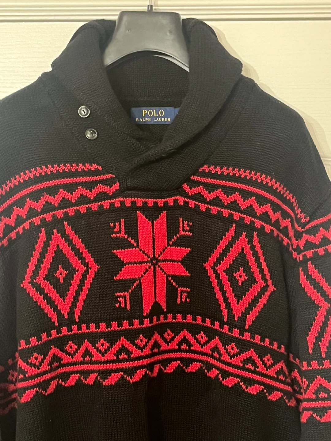 Cozy up in this stylish Polo Ralph Lauren shawl collar sweater! It features a festive snowflake design in red on a black background. Men’s Size Medium and in great condition, perfect for the holidays or any chilly day.