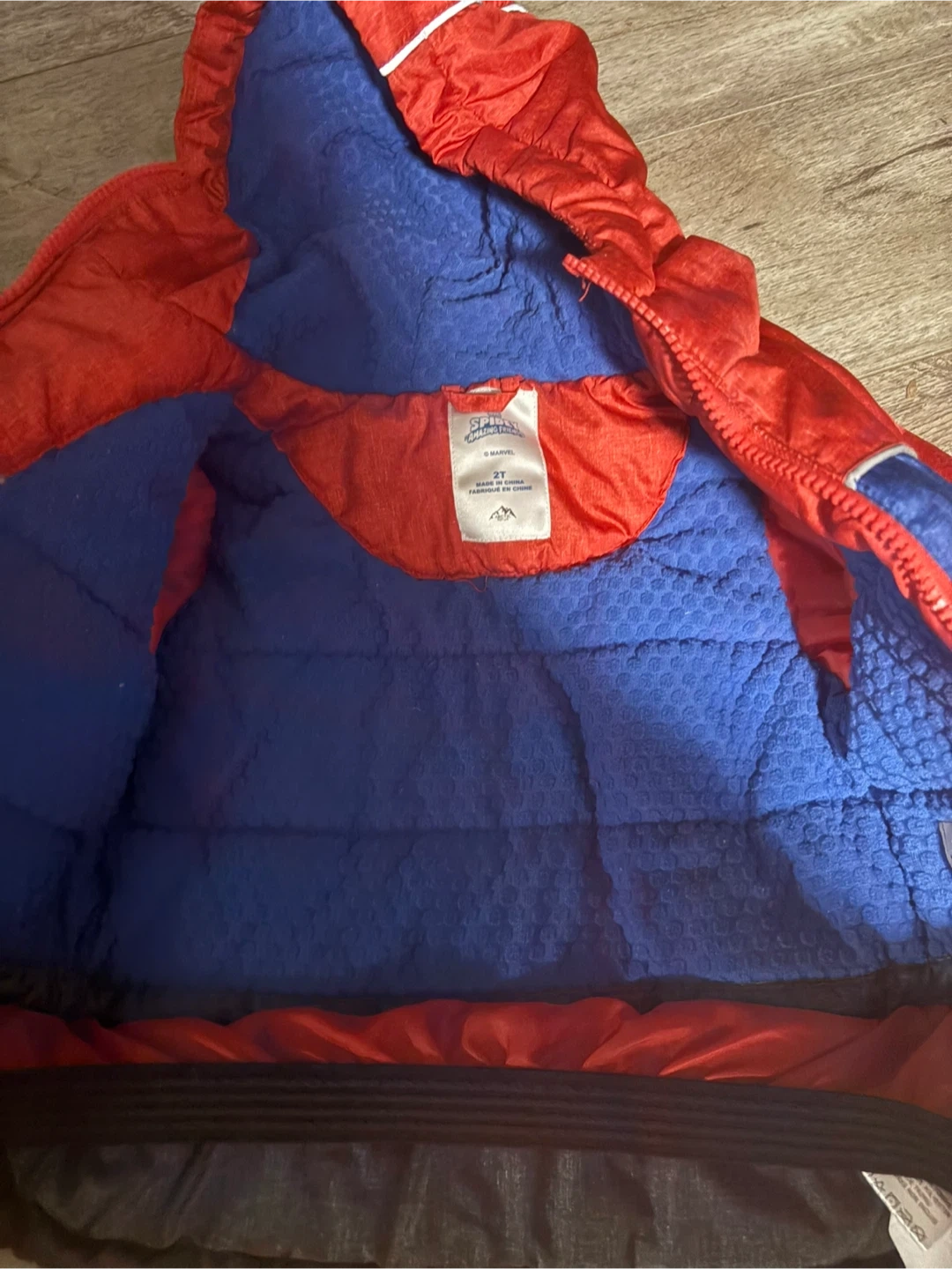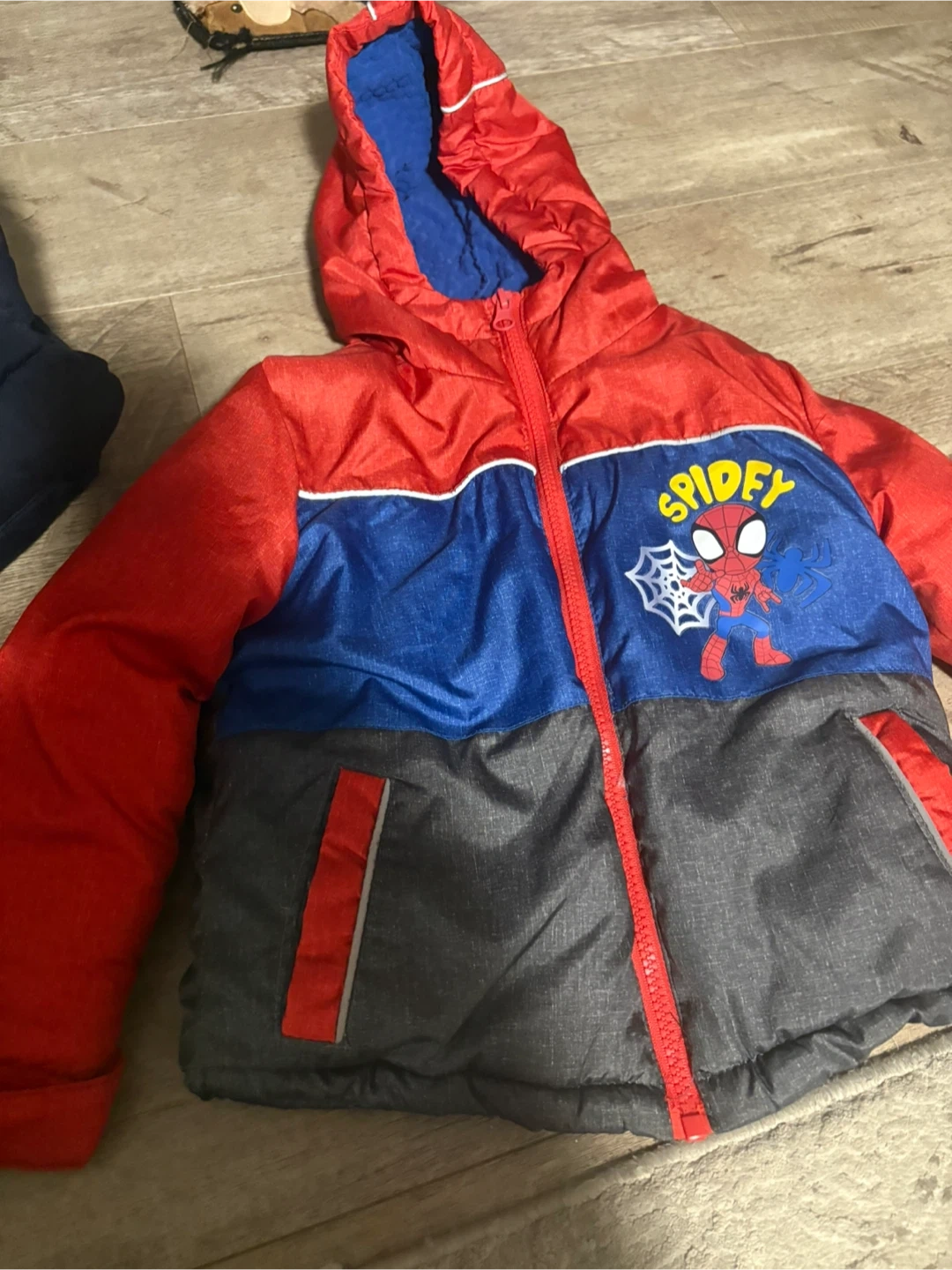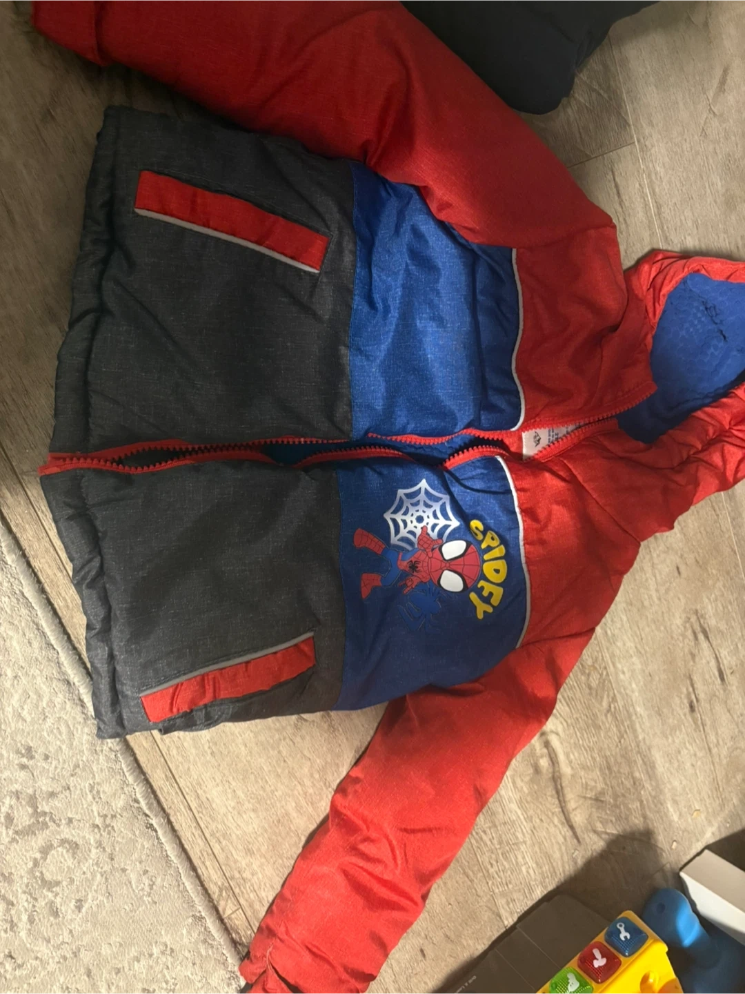 A cozy Spiderman jacket in size 5T! It's in great condition and features a vibrant red, blue, and grey colour scheme. Perfect for keeping your little one warm during cooler weather!