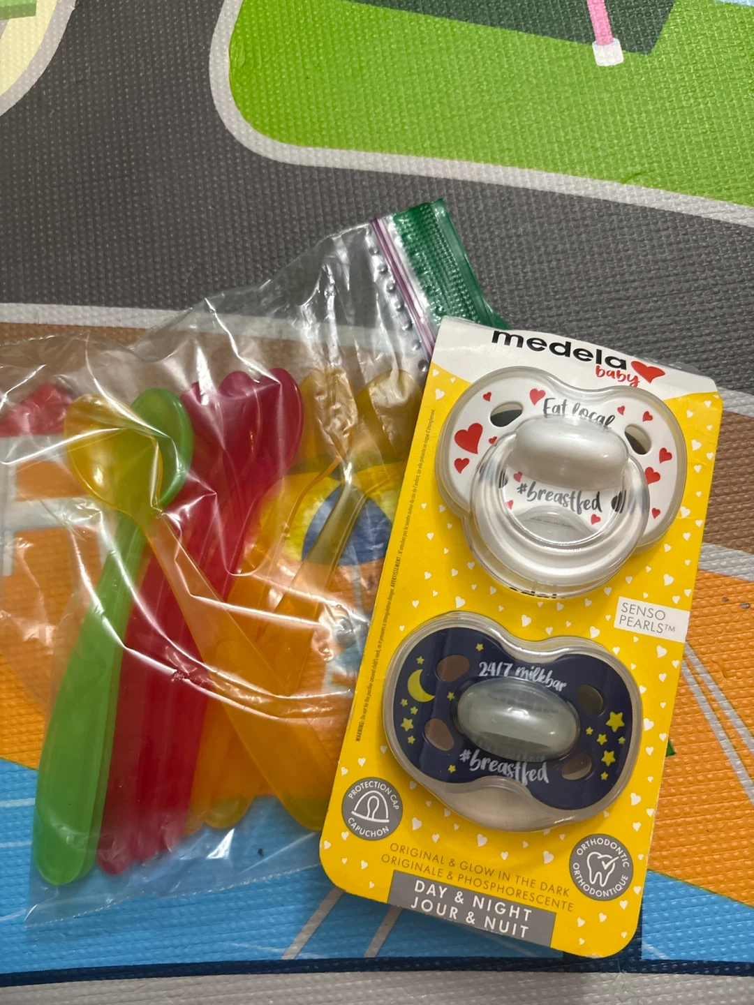 Selling a set of Medela Baby pacifiers, perfect for day and night use! These pacifiers are original and glow in the dark, making them easy to find during nighttime. They come with a protection cap and are orthodontically designed for your baby's comfort. Brand new and ready for a new home!
