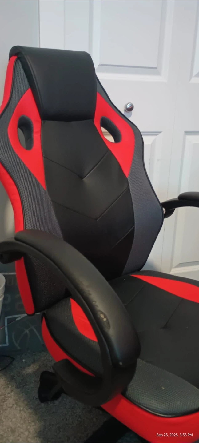 Selling a gaming chair in red and black. It has some wear on the armrests, as shown in the pictures. Still a comfortable chair for gaming or working from home!