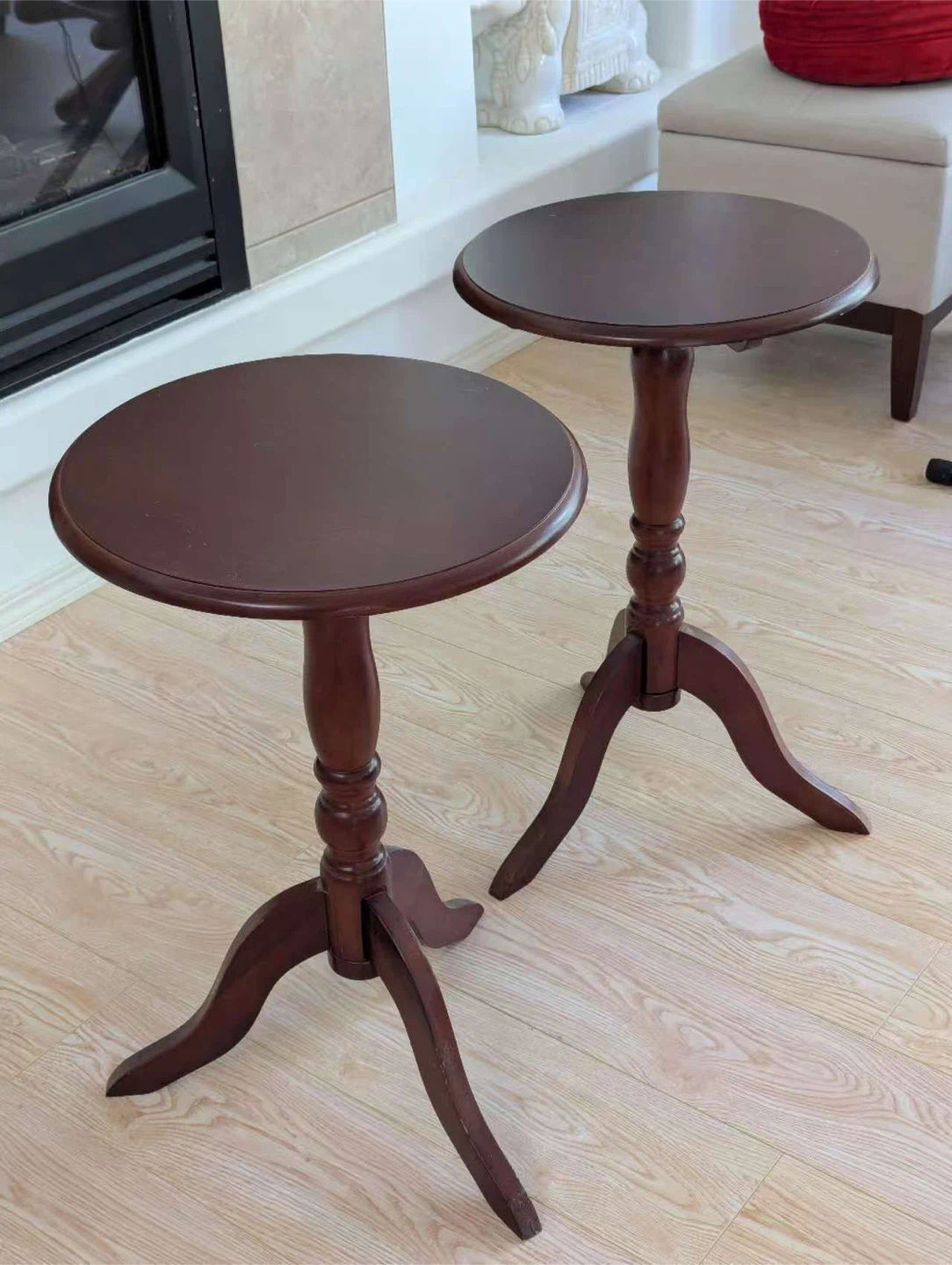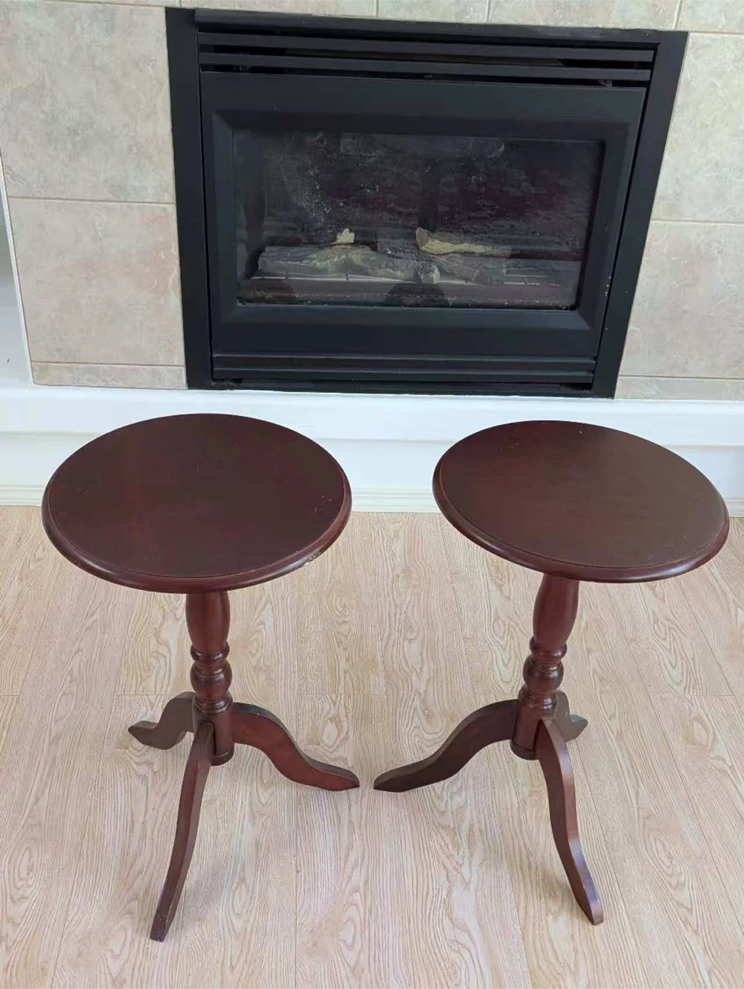 Selling a pair of dark wood accent tables. They're in good condition and would look great in any living room or bedroom. Perfect for lamps, plants, or just as a decorative piece