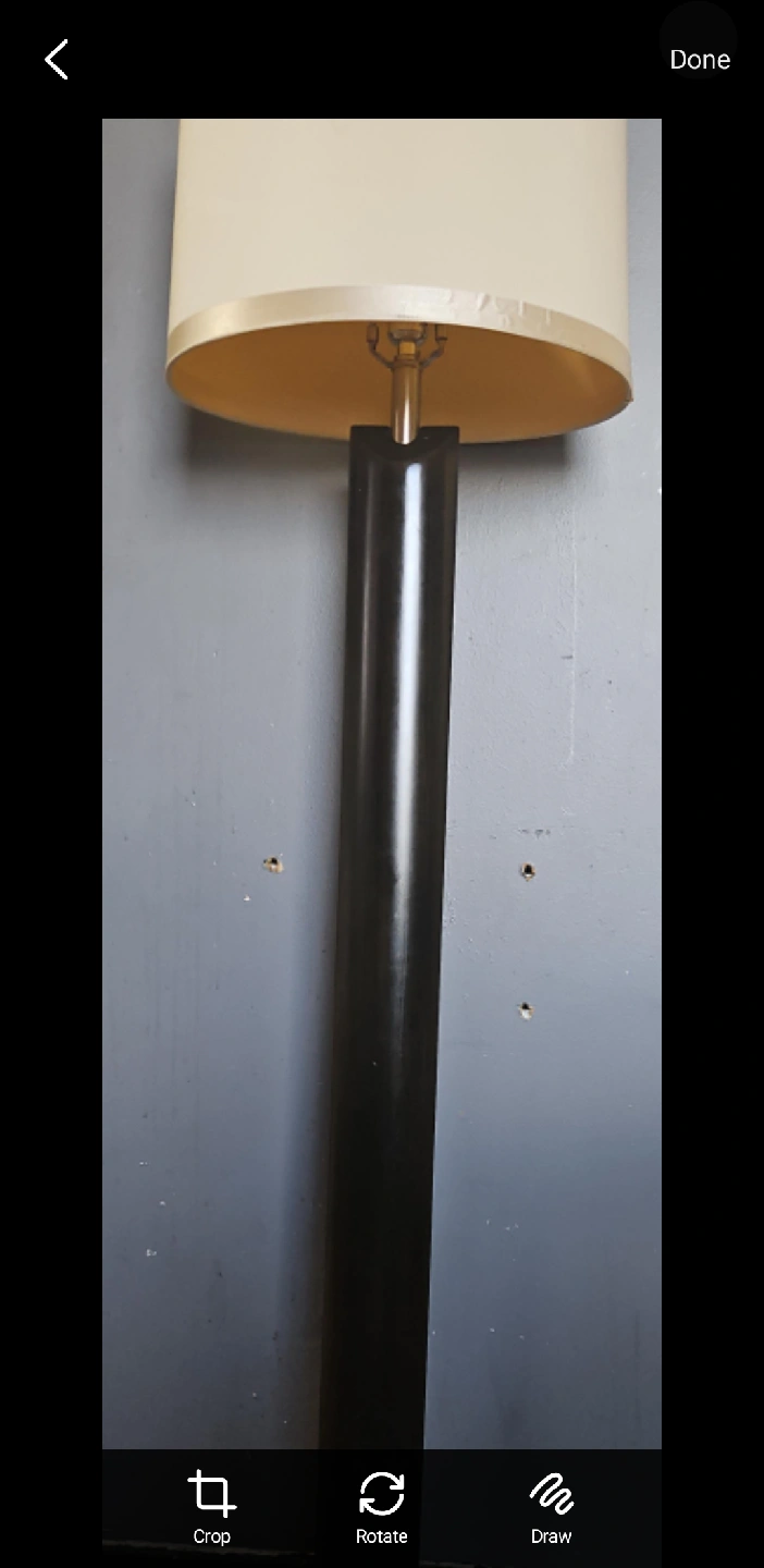 Selling a floor lamp featuring a sleek black base and a neutral beige shade. It would look great in any living room or bedroom setting! The lamp provides a warm and inviting glow, perfect for creating a cozy atmosphere in your home
