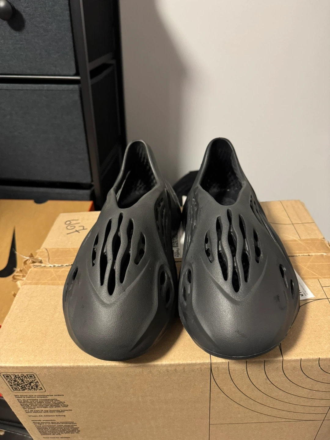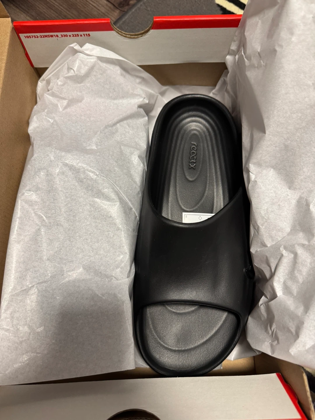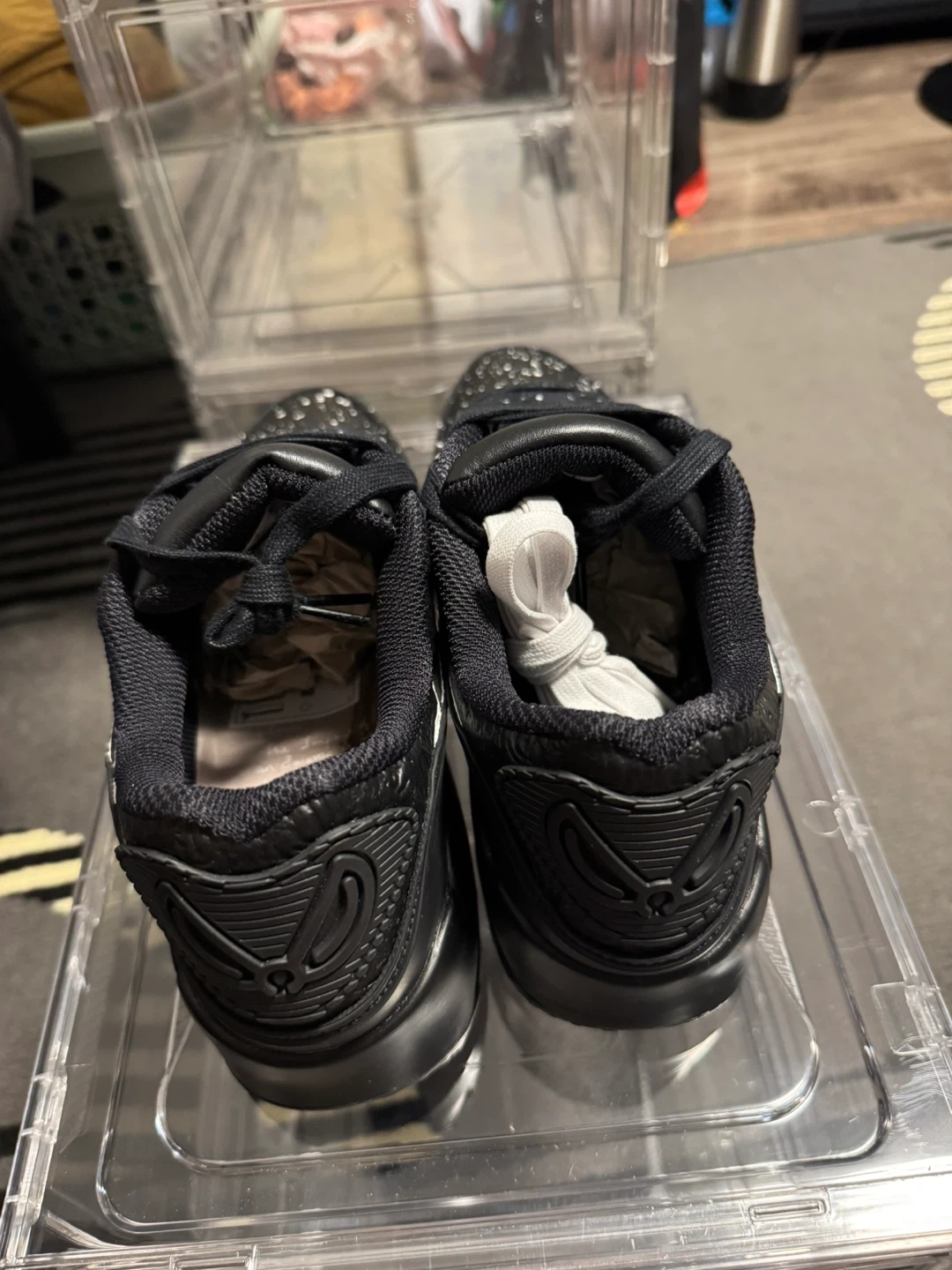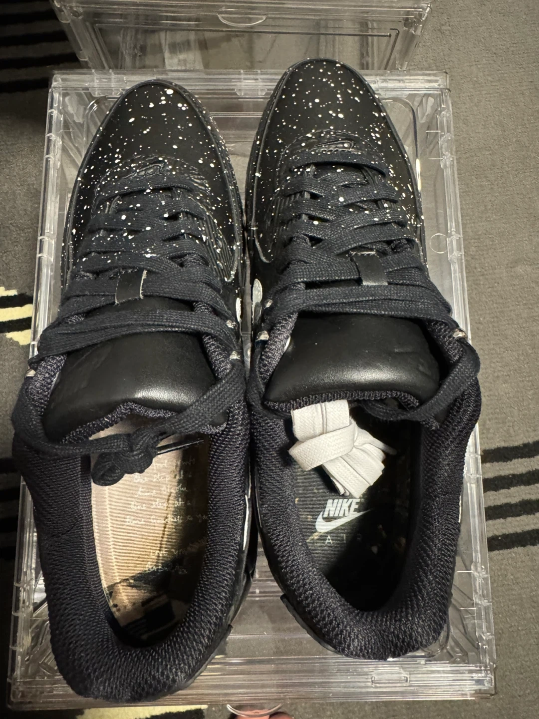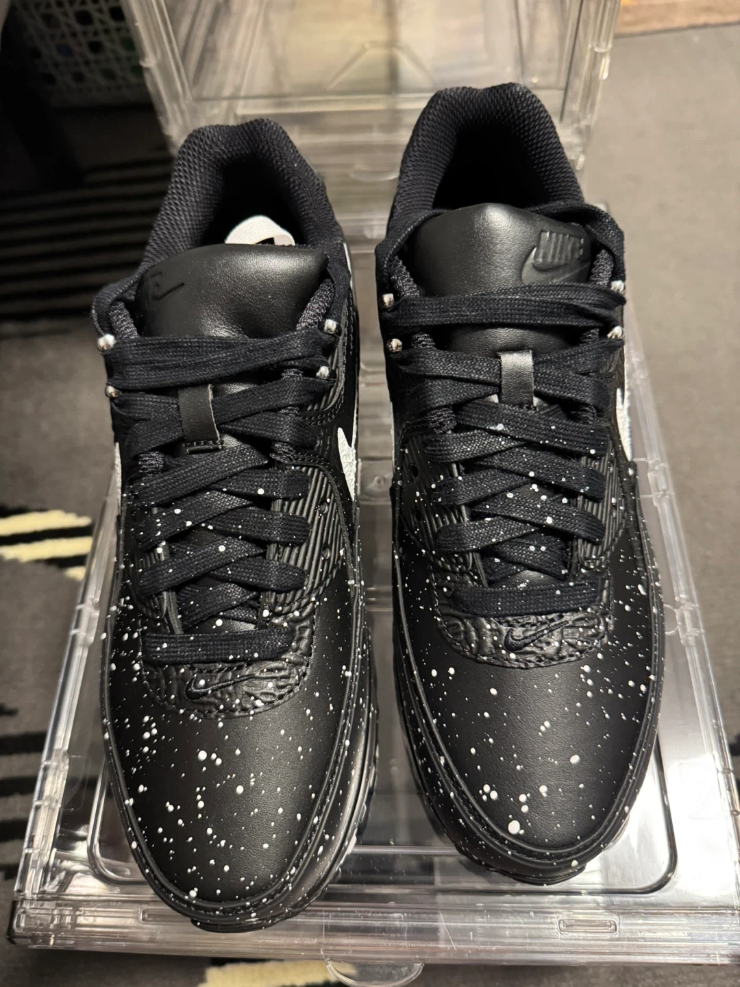 Selling a pair of Nike Air Max 90 sneakers and Recotix slides. Both are black and appear to be in good condition. The Air Max 90s have a unique speckled design. Comes with the box!