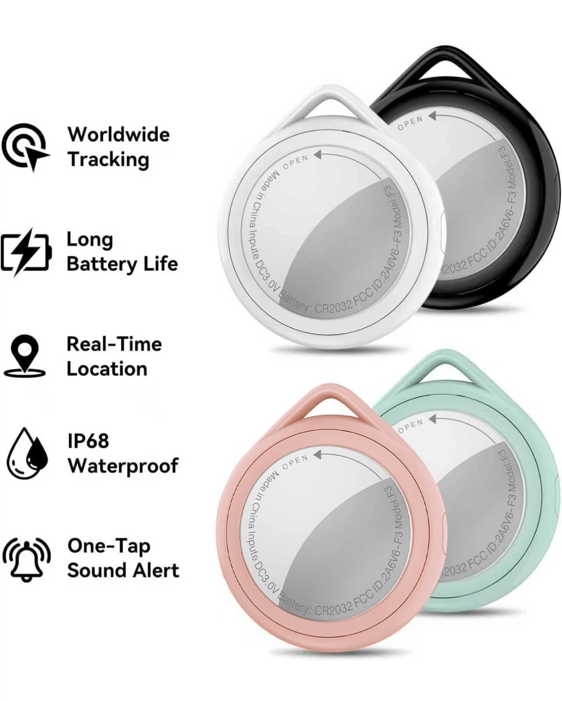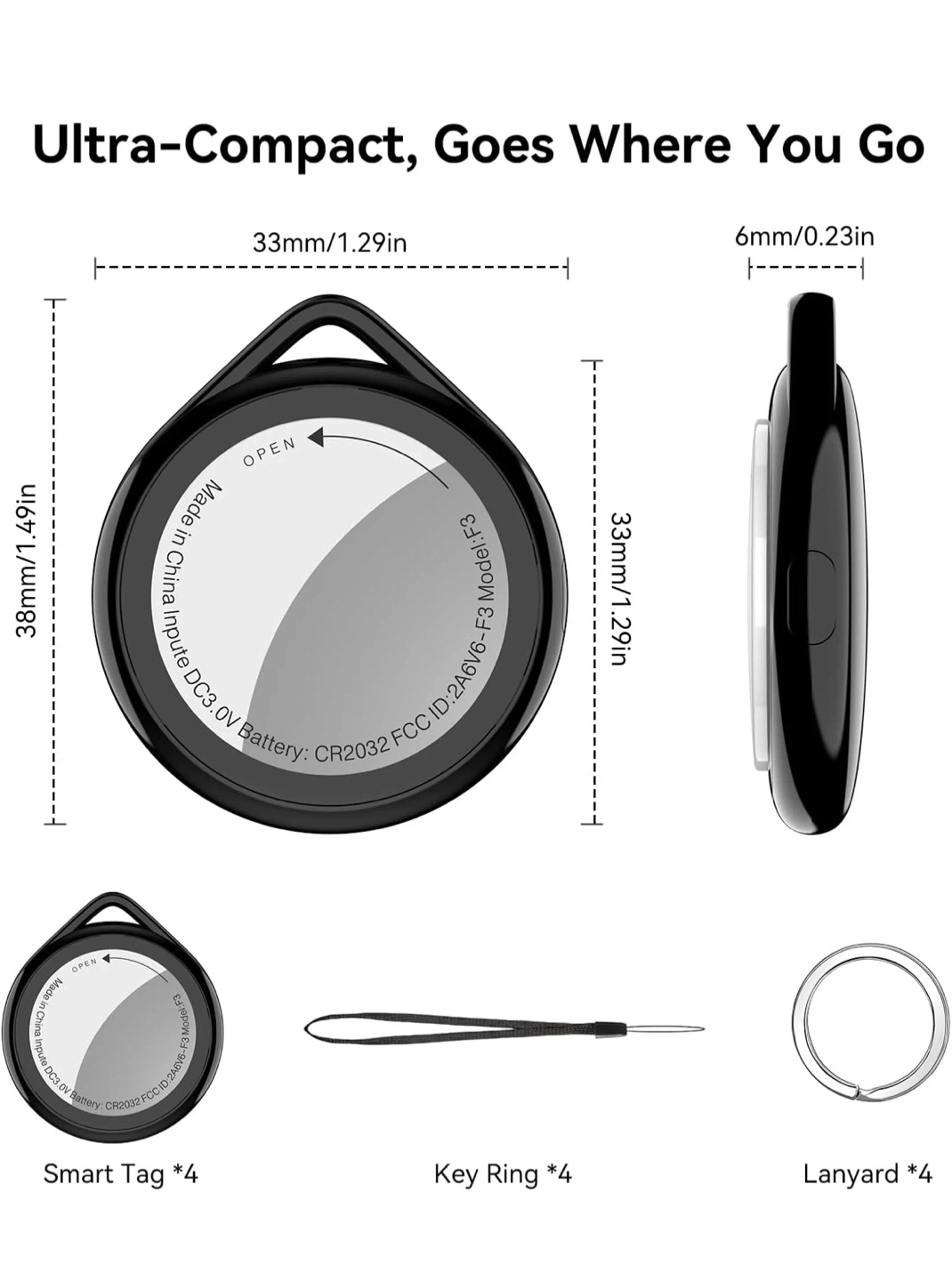 Air Tracker Tags 4 Pack, Bluetooth Tracker & Item Locator Work with Apple Find My (iOS Only), Replaceable Battery, Waterproof Smart Tag for Keys, Wallet, Suitcases Keep track of your valuables with this ultra-compact smart tag! It's designed to go wherever you go, with dimensions of 33mm x 38mm x 6mm. This tag is waterproof with an IP68 rating, offers worldwide tracking, and has a long battery life. It also features real-time location updates and a one-tap sound alert to help you find your items quickly. Comes with a key ring and lanyard!