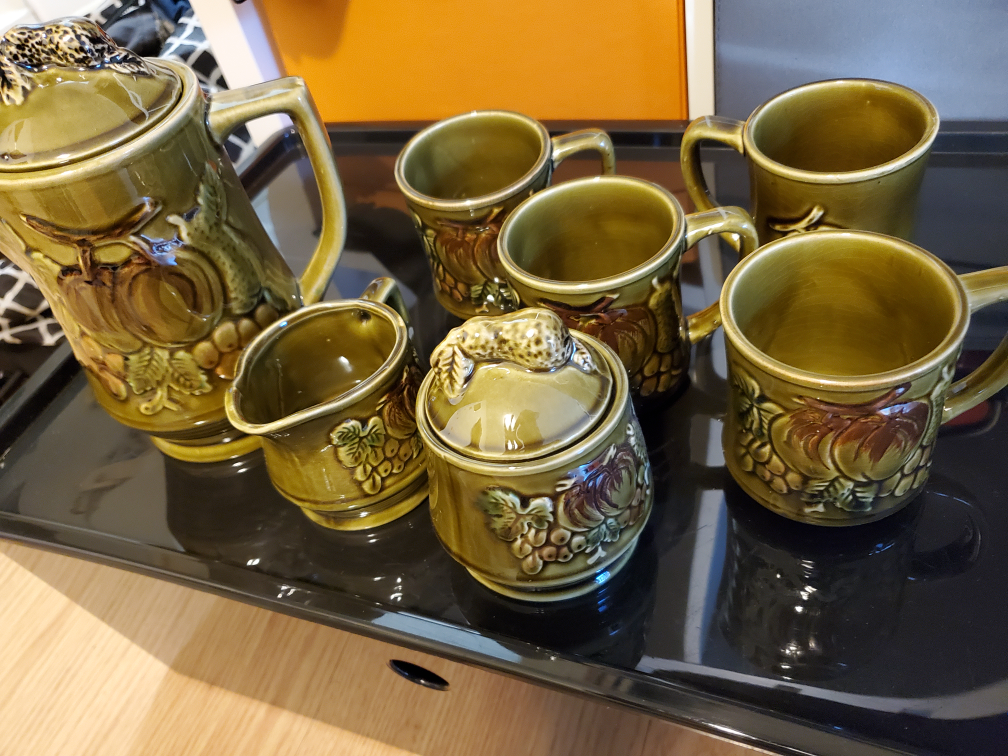 Selling a beautiful vintage olive green ceramic tea set. It features a lovely embossed fruit design. Stamped with "Made in Japan" on the bottom. Perfect for adding a touch of retro charm to your tea time!