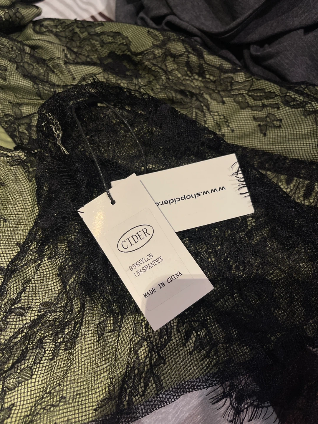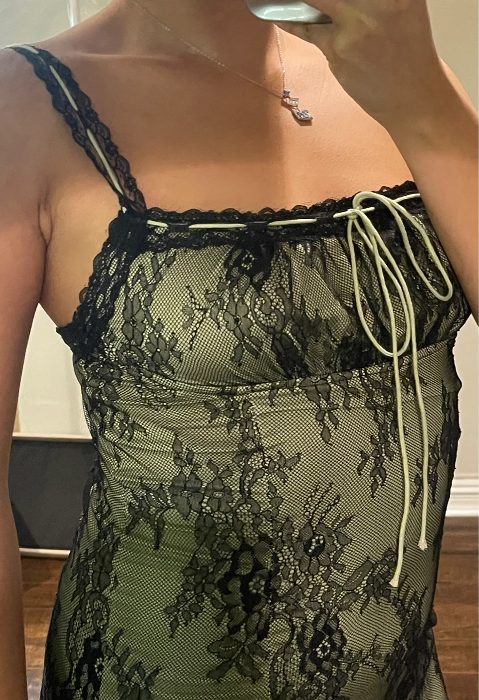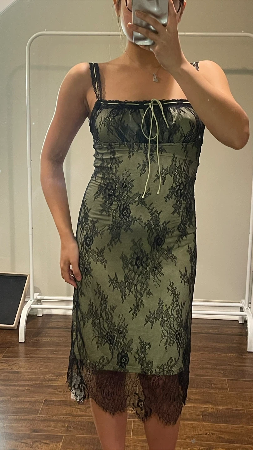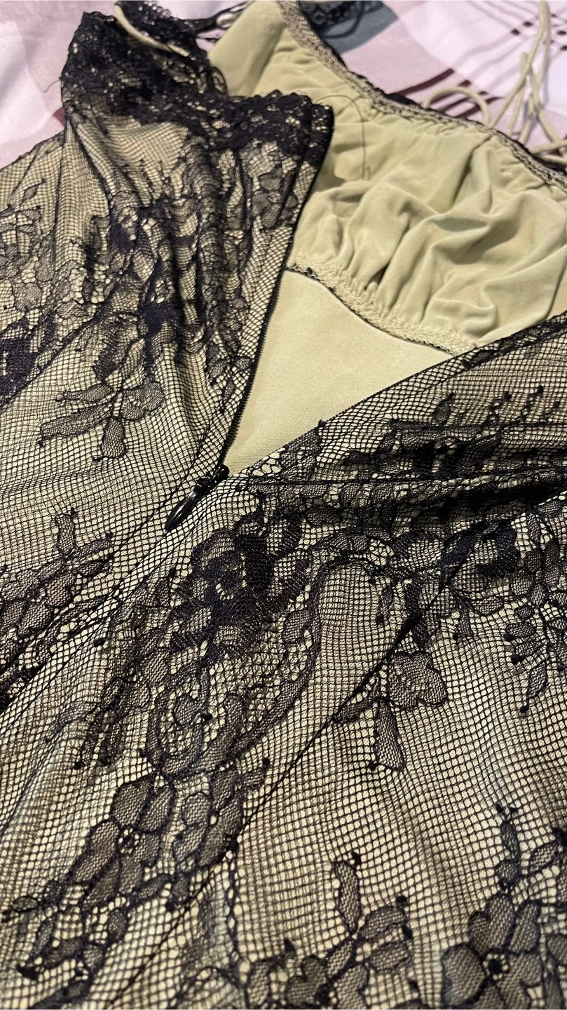Never worn lace trimmed dress in black and olive. It has a delicate lace overlay with straps. Material: 85% nylon, 15% spandex