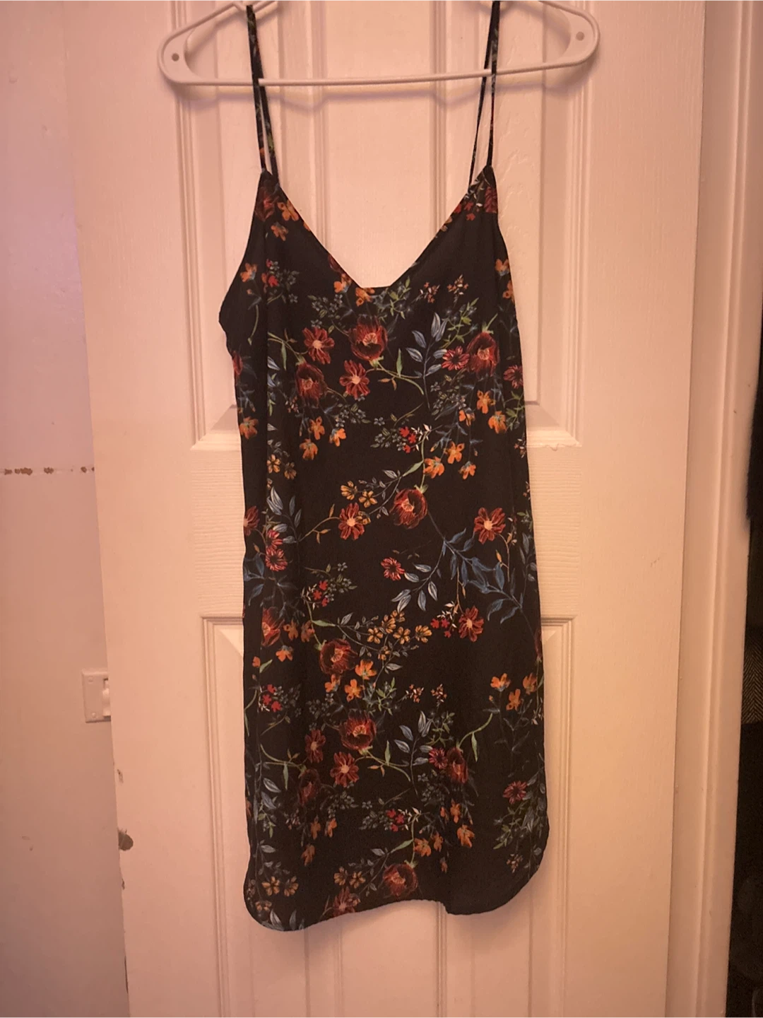 Selling a cute cami dress with a floral print! It's perfect for summer or layering. The dress is in great condition and features a V-neck and adjustable straps