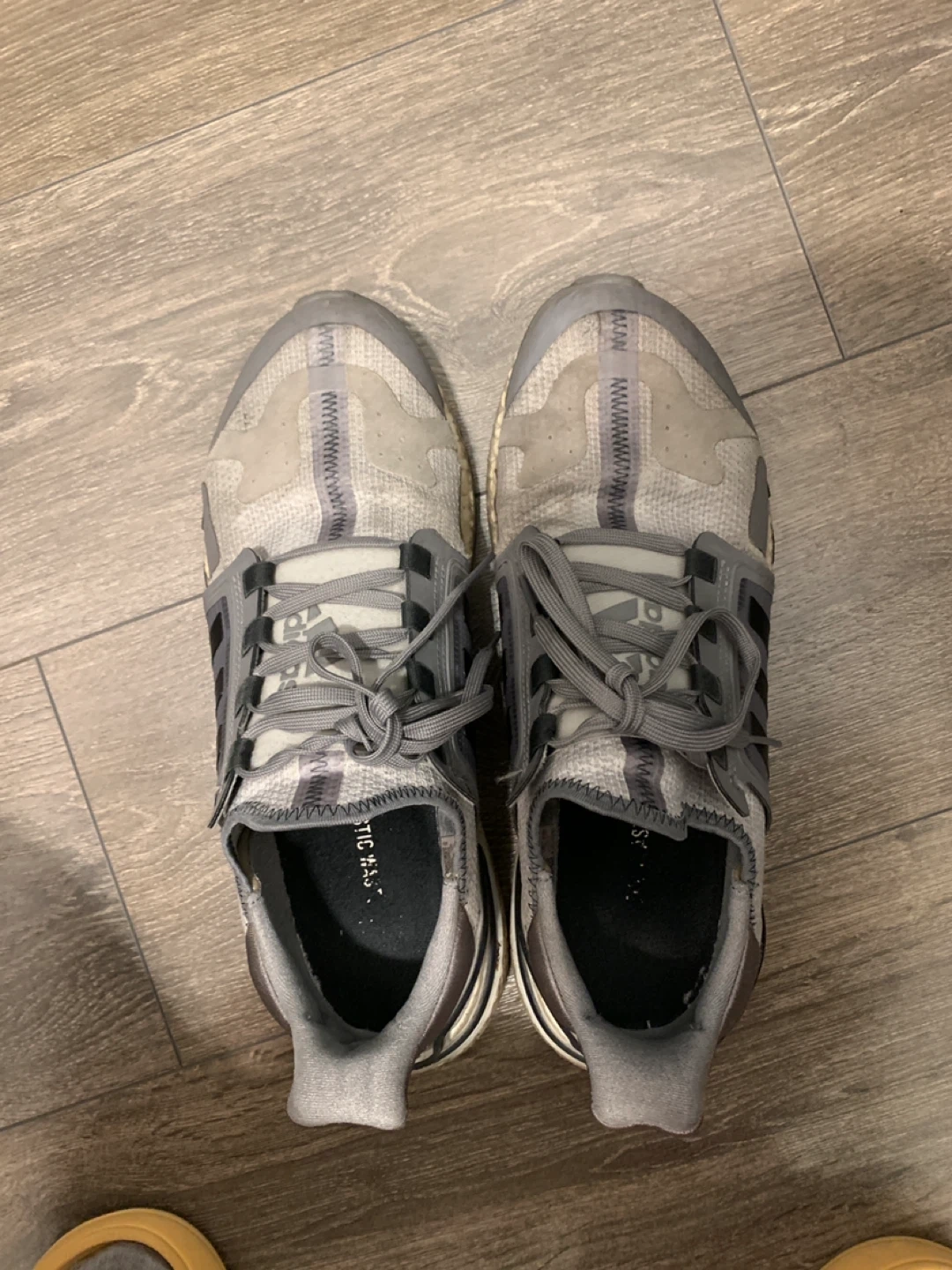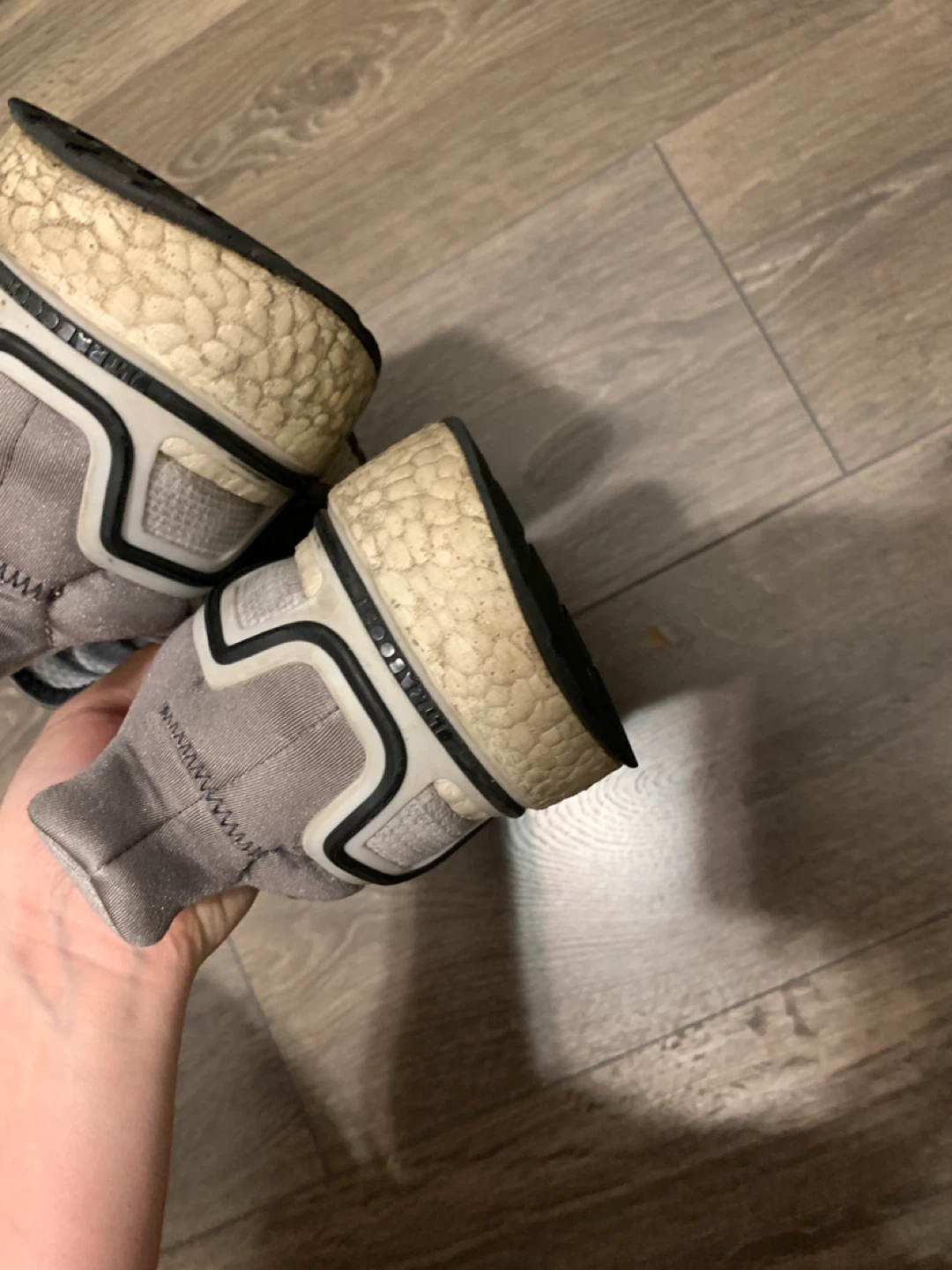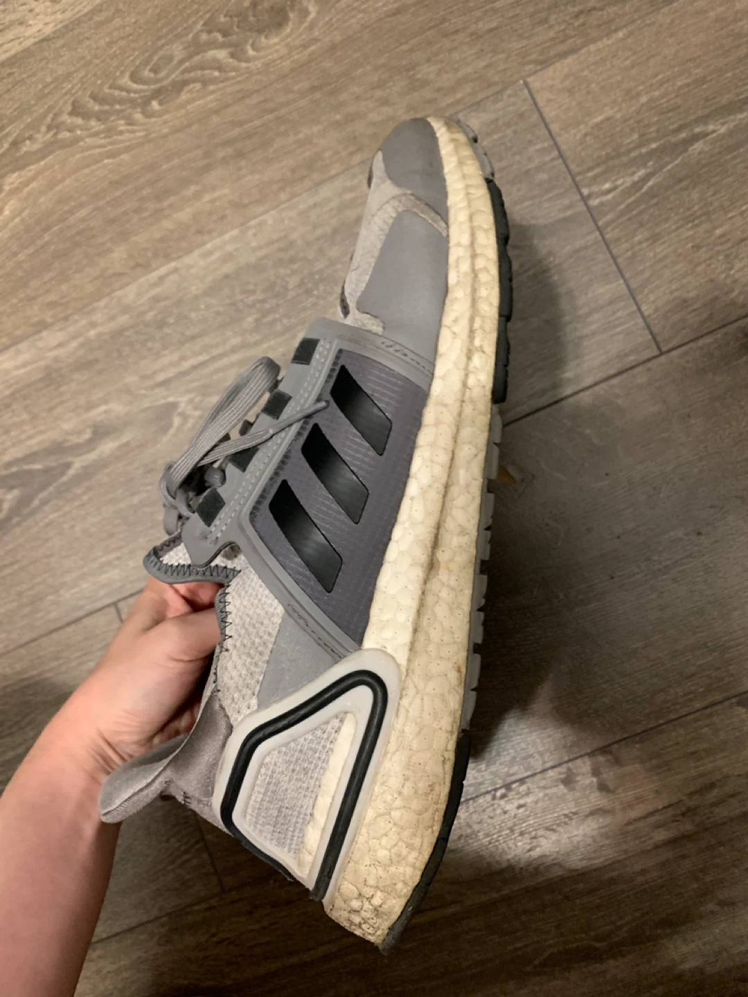 Selling a pair of Adidas Ultraboost running shoes in gray! They have some signs of wear, as you can see in the photos, especially on the soles and the boost midsole. Still lots of life left in them for running or casual wear