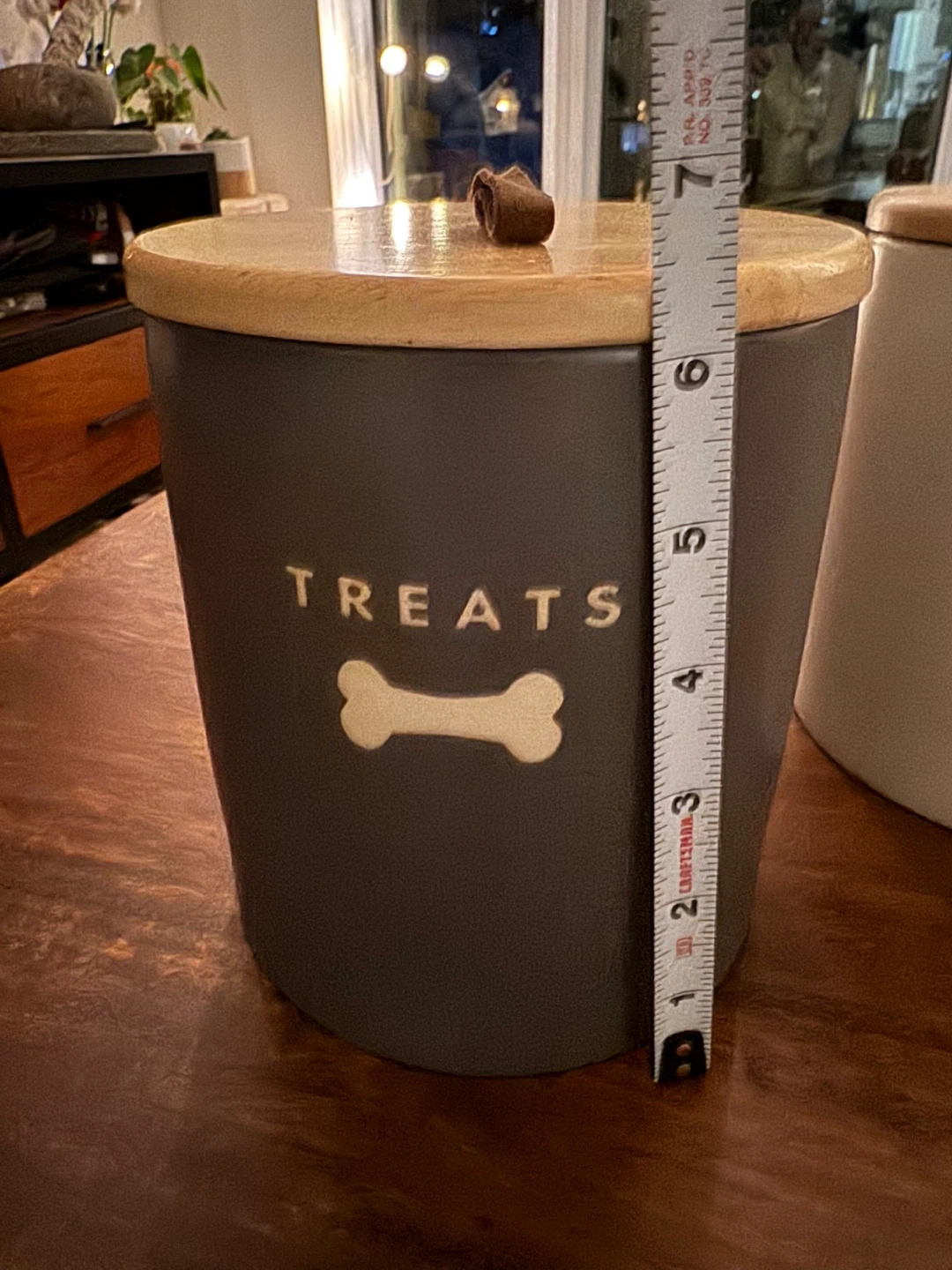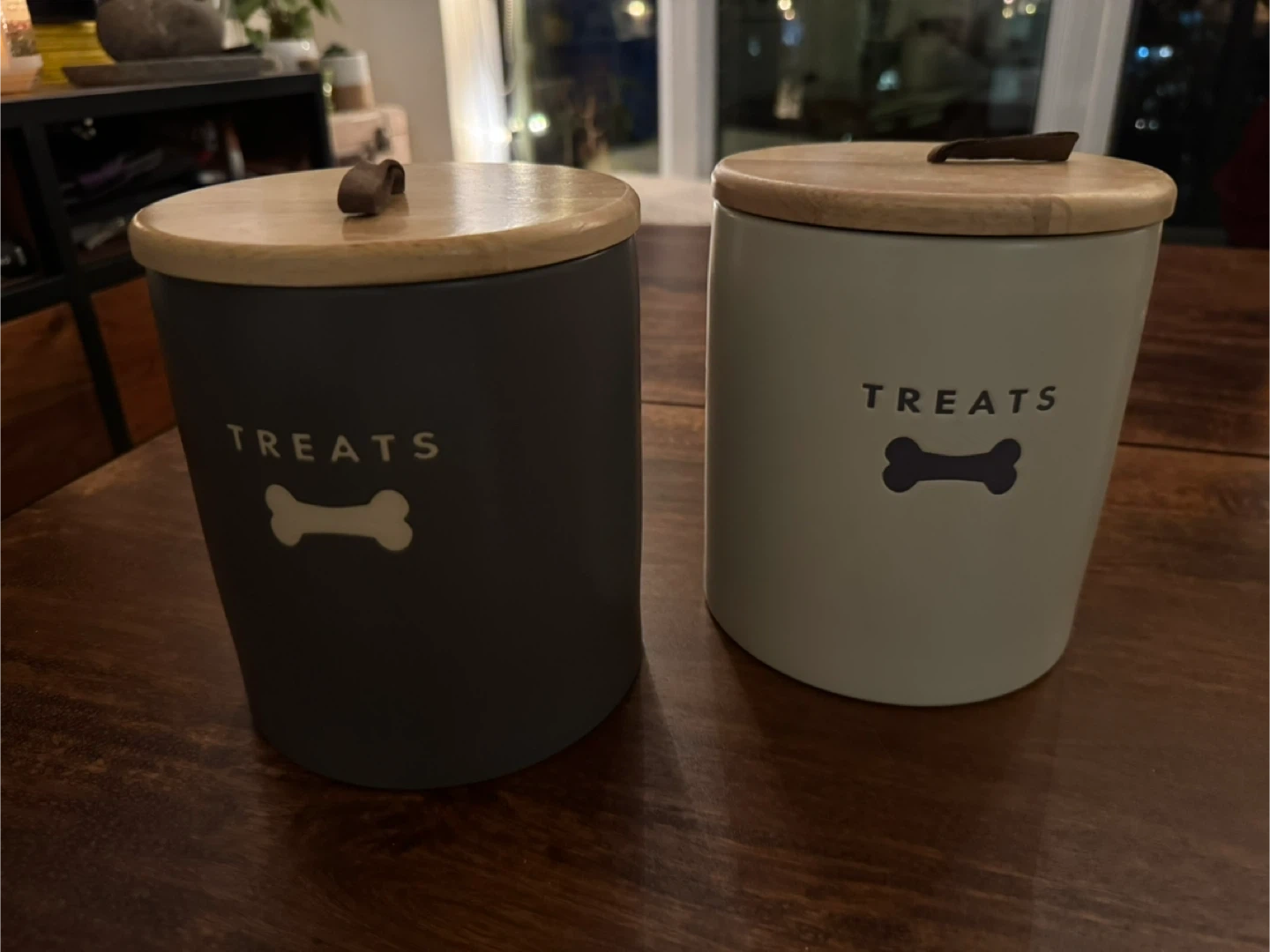 Selling a cute dog treat canister! It's grey with a wooden lid and a bone design on the front. It measures about 7 inches tall and 6 inches in diameter. Perfect for keeping your furry friend's treats fresh and organized
