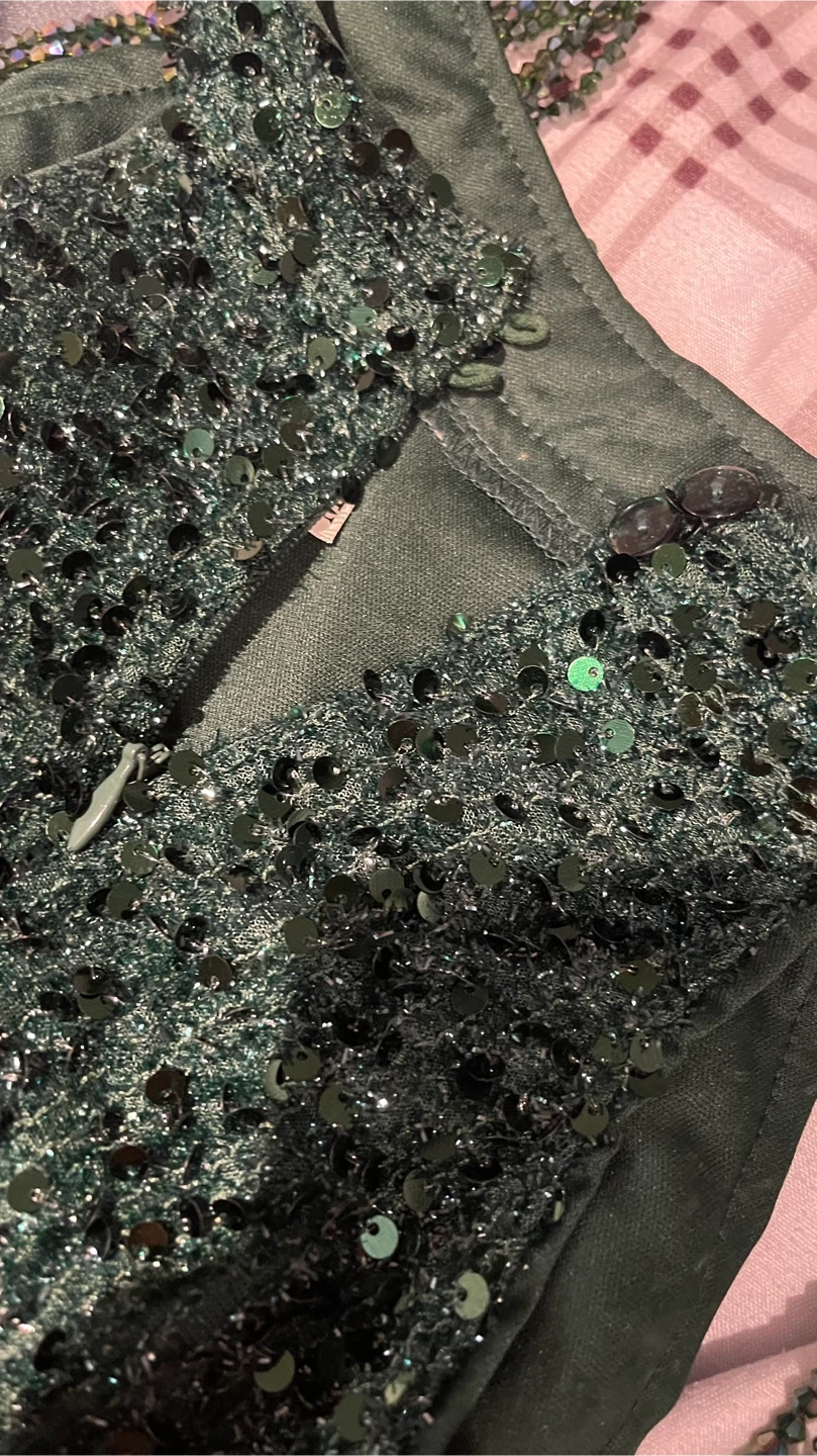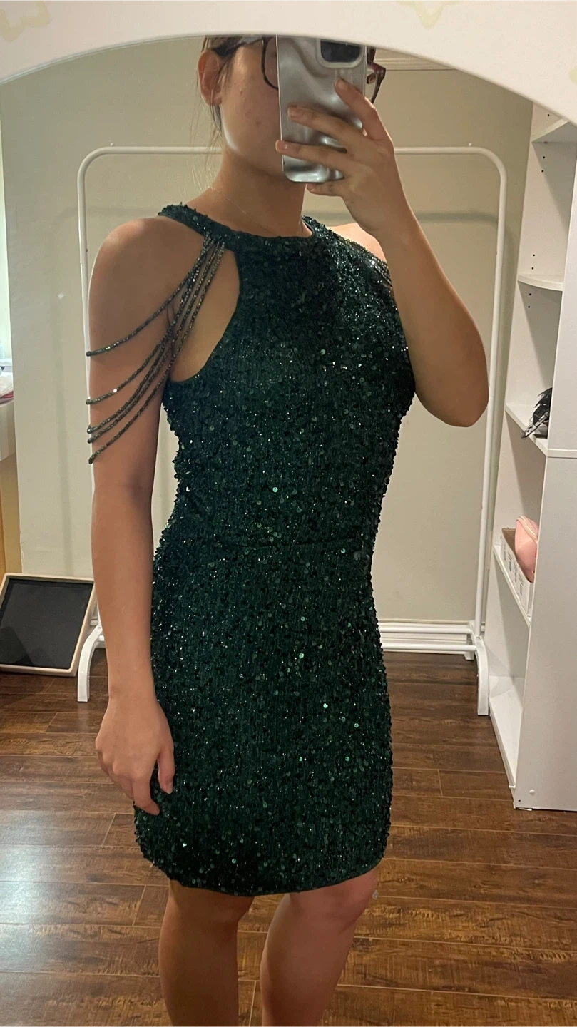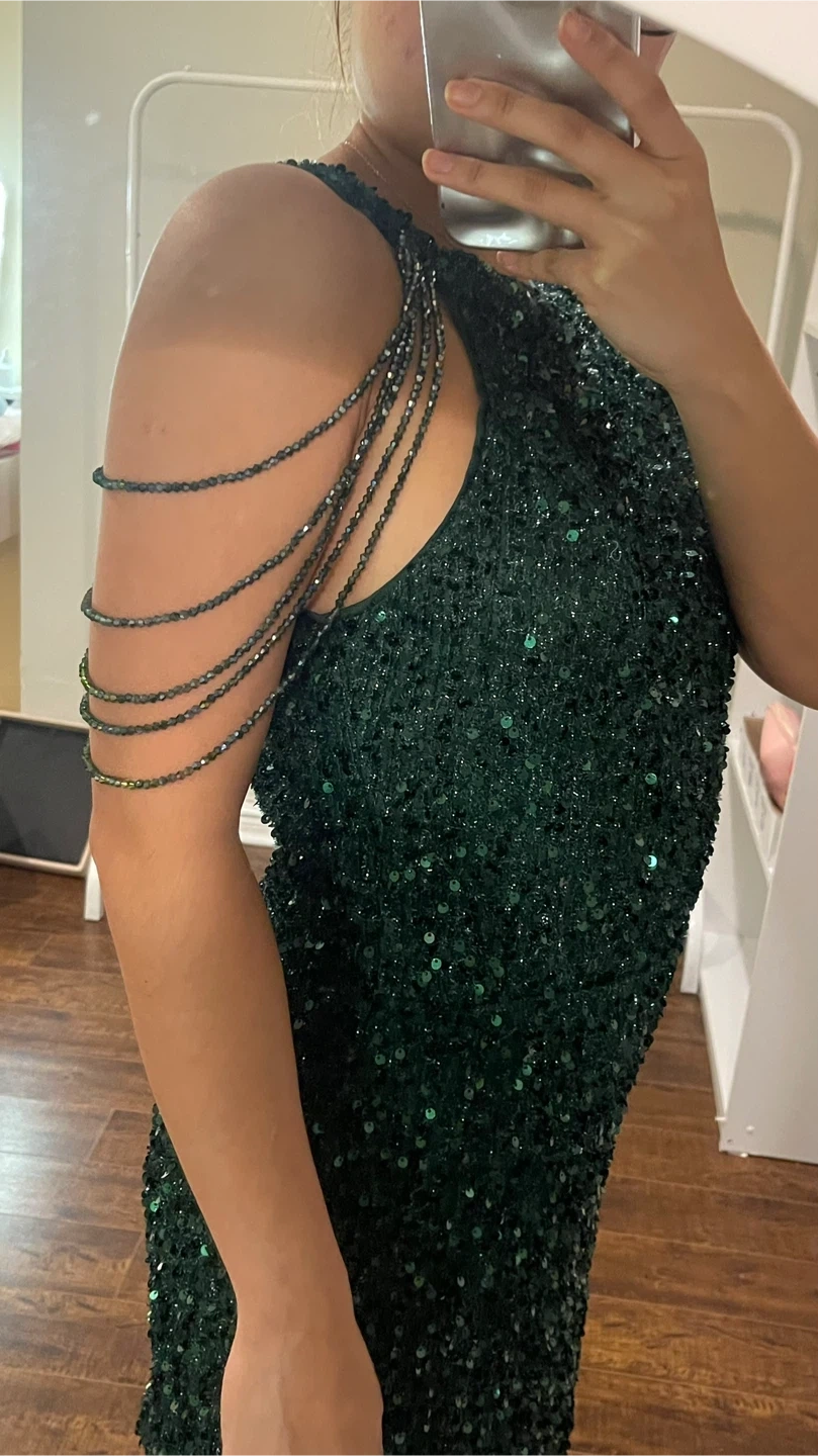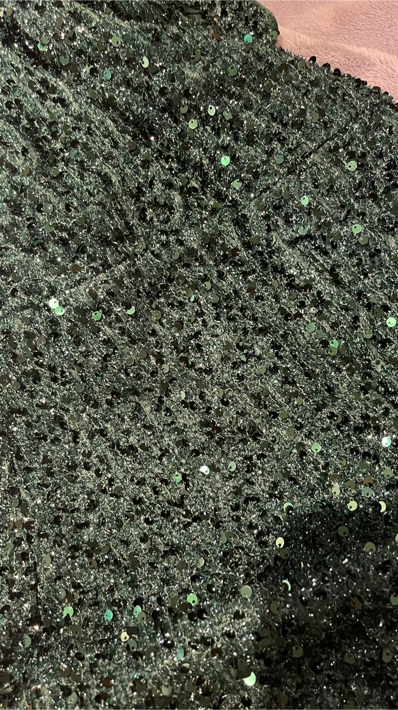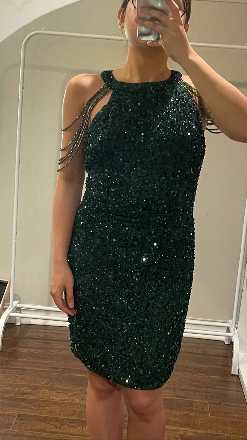 Selling a beautiful green sequin dress with beaded shoulder detail. It's in great condition and perfect for a night out or special occasion!