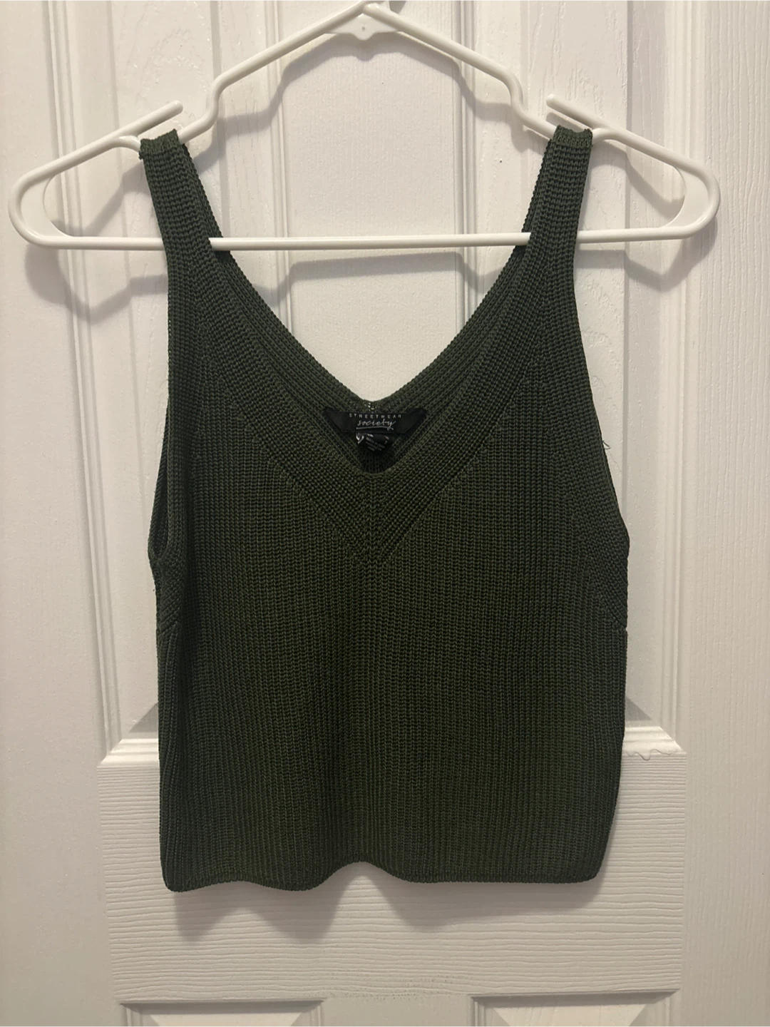 Selling a cute knit tank top from Streetwear Society! It's an olive green colour and has a V-neck. Great for layering or wearing on its own during warmer weather