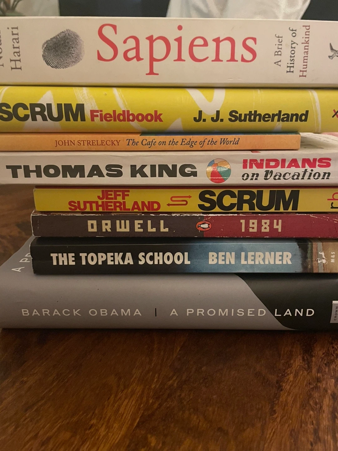 Make me an offer Selling a mixed lot of books, perfect for expanding your reading collection! Titles include: - Sapiens by Noah Harari - SCRUM Fieldbook by J.J. Sutherland - The Cafe on the Edge of the World by John Strelecky - Indians on Vacation by Thomas King - Scrum by Jeff Sutherland - 1984 by Orwell - The Topeka School by Ben Lerner - A Promised Land by Barack Obama