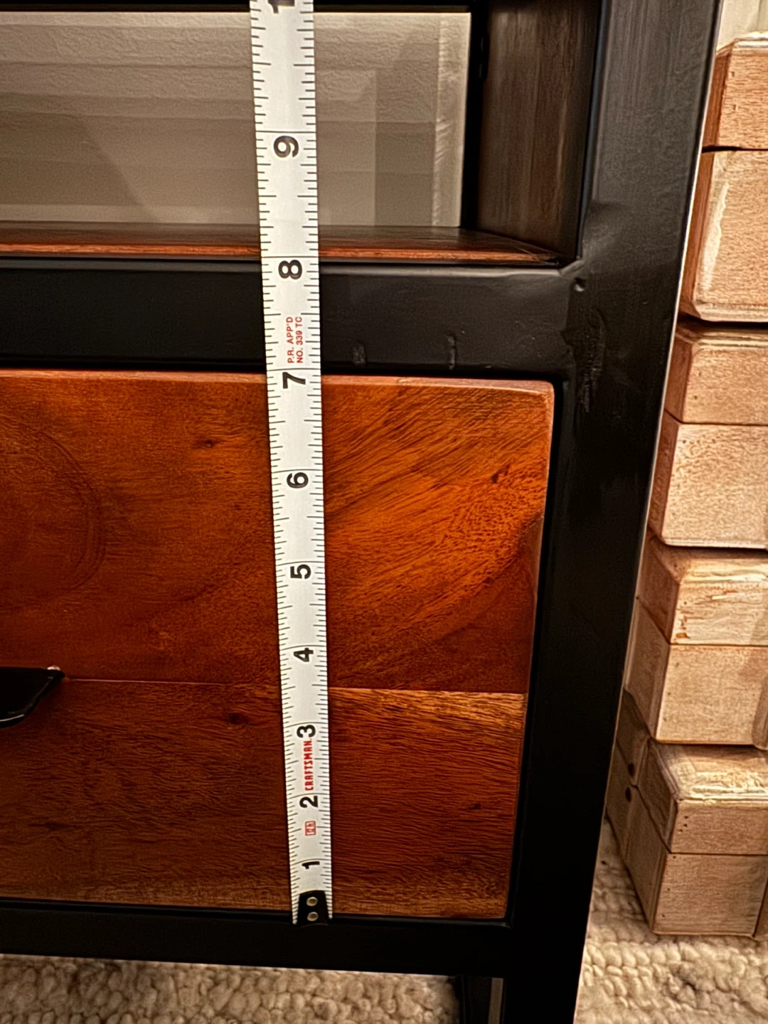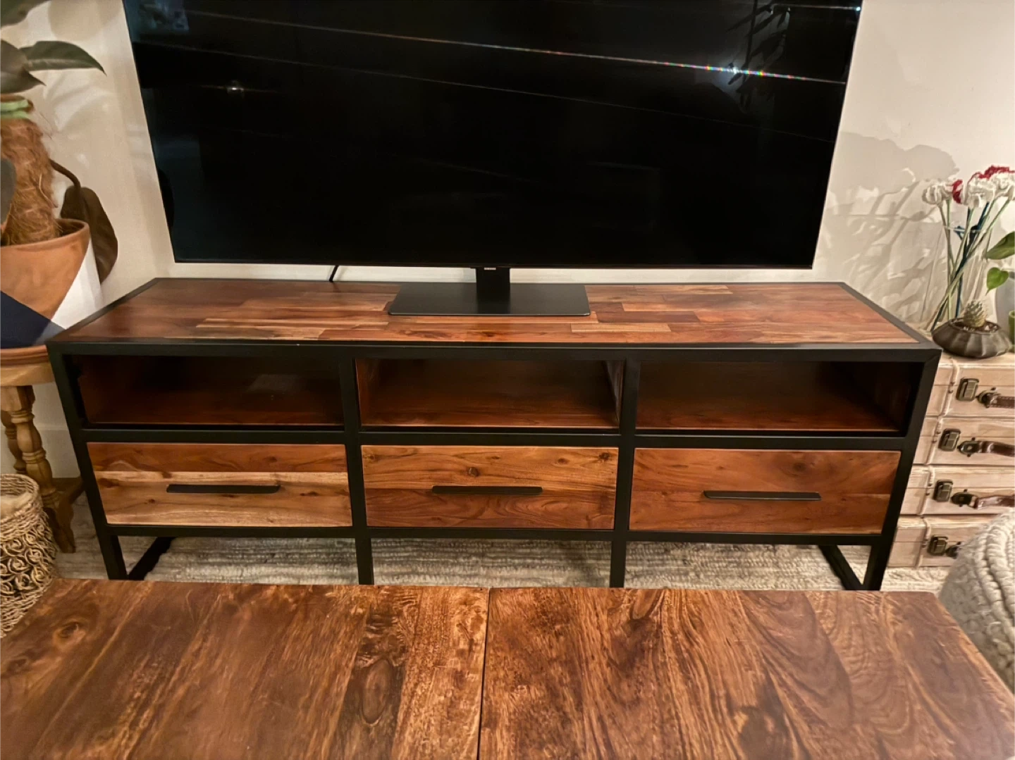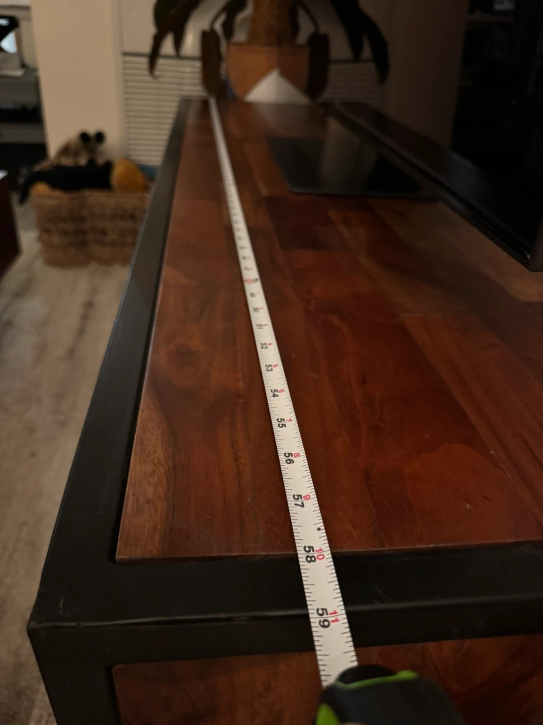 No, your tv will not collapse the table- This is a solid wood and metal TV stand. It's about 59 inches wide, 23 inches tall, and 15 inches deep. It's in great shape and would look great in any living room!