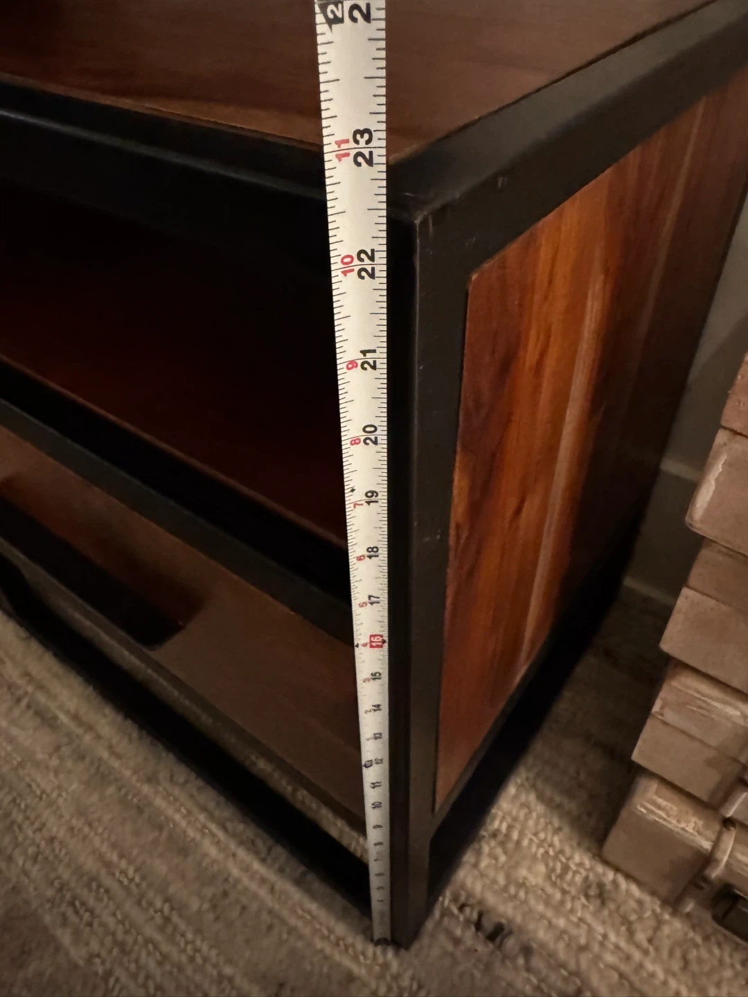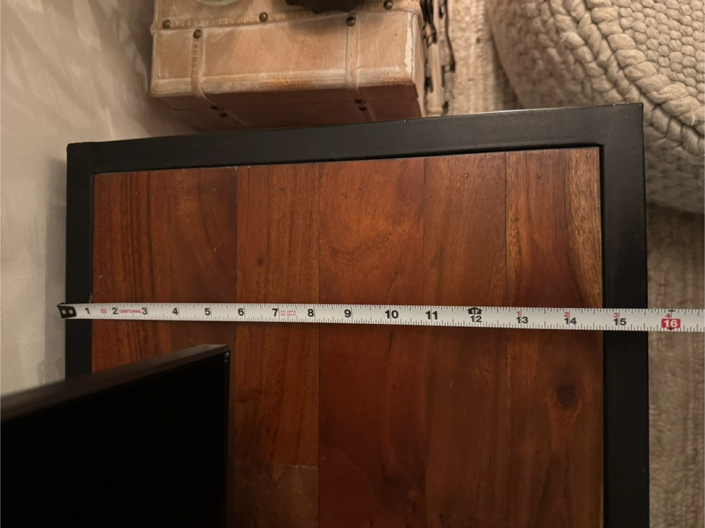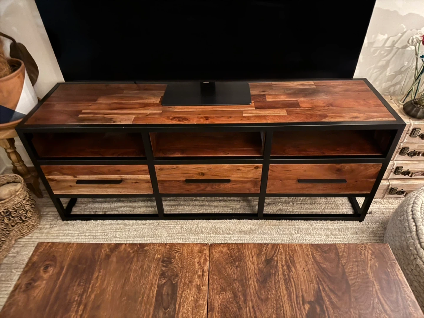 No, your tv will not collapse the table- This is a solid wood and metal TV stand. It's about 59 inches wide, 23 inches tall, and 15 inches deep. It's in great shape and would look great in any living room!