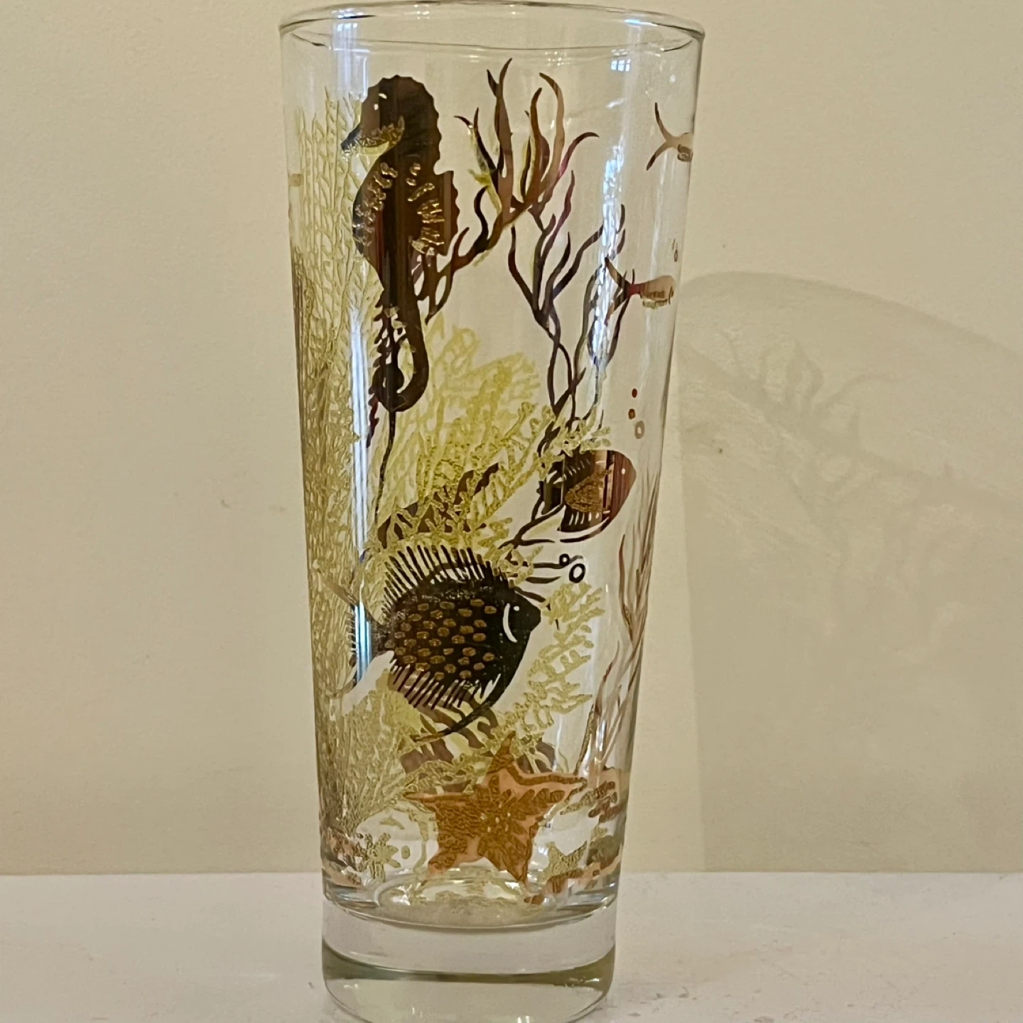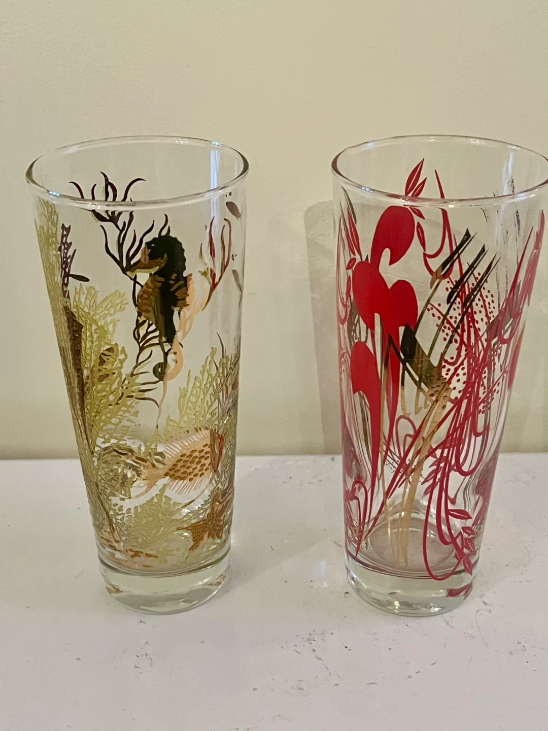 Mid-century Bartlett Collins glasses in good vintage condition, one from the Under-the-Sea collection in 22K gold and the other red Atomic.