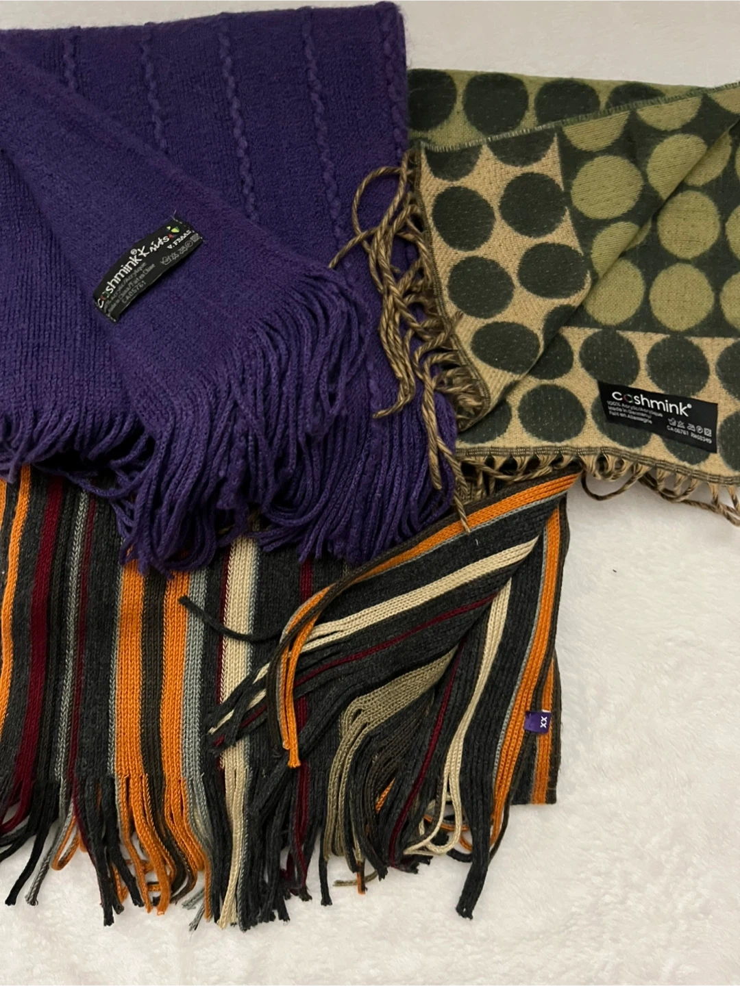 Three Cashmink scarves. One is a lovely purple, green polka dot and a stylish striped design. Perfect for warmth and style to your wardrobe this season